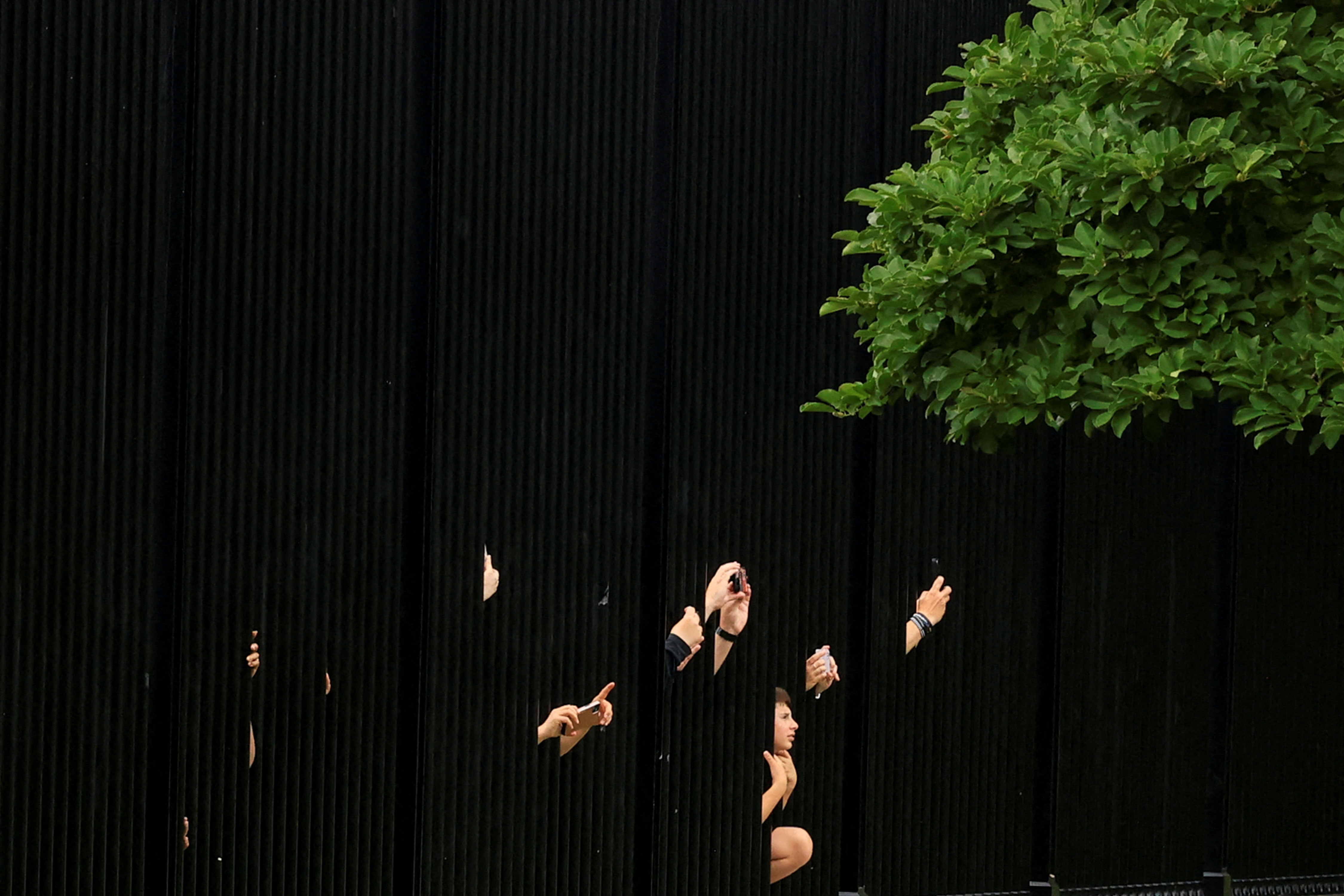 Tourists reach through fencing with their phones to photograph the White House after President Trump cut his G7 trip short and returned to Washington on June 17, 2025. (Photo by Kevin Mohatt/Reuters)