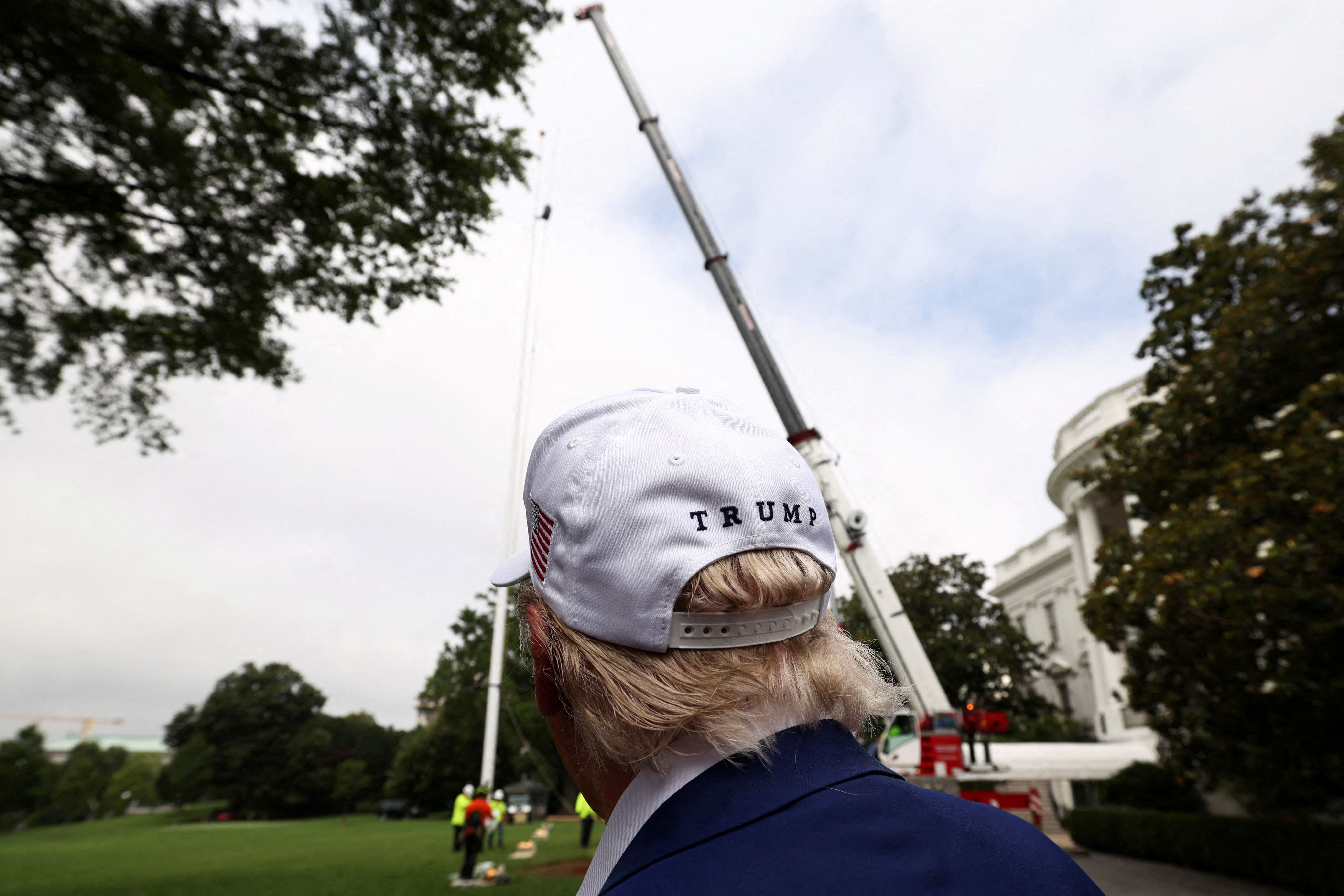 U.S. President Donald Trump looks on as workers install a new flagpole on the South Lawn at the White House in Washington on June 18, 2025. (Photo by Kevin Lamarque/Reuters)