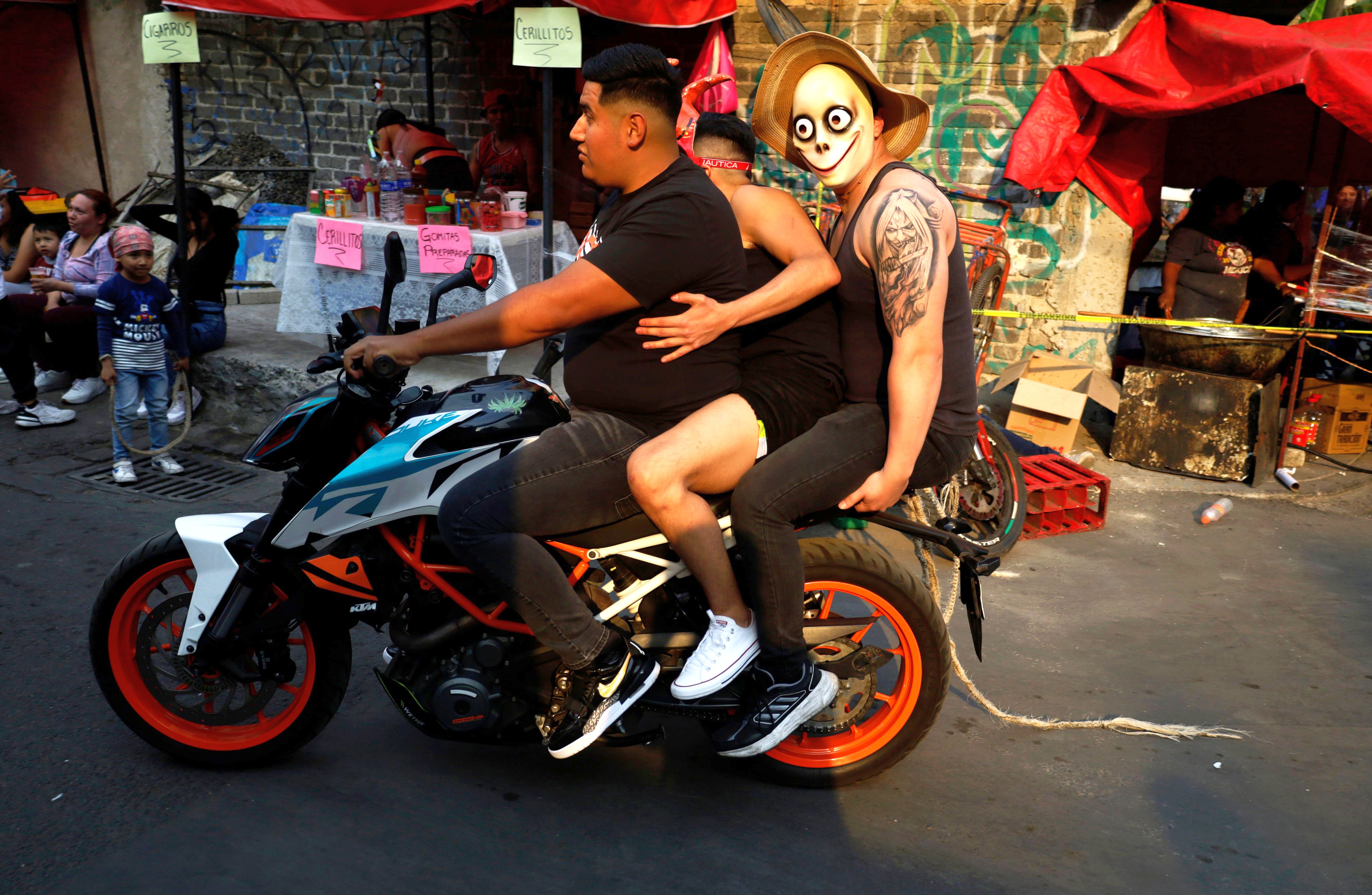 Members of Los Judas de Santo Domingo are riding aboard a motorcycle with residents of Pedregal de Santo Domingo in Mexico City on March 28, 2024, participating in a procession for the Holy Week celebrations. (Photo by Gerardo Vieyra/NurPhoto/Rex Features/Shutterstock)