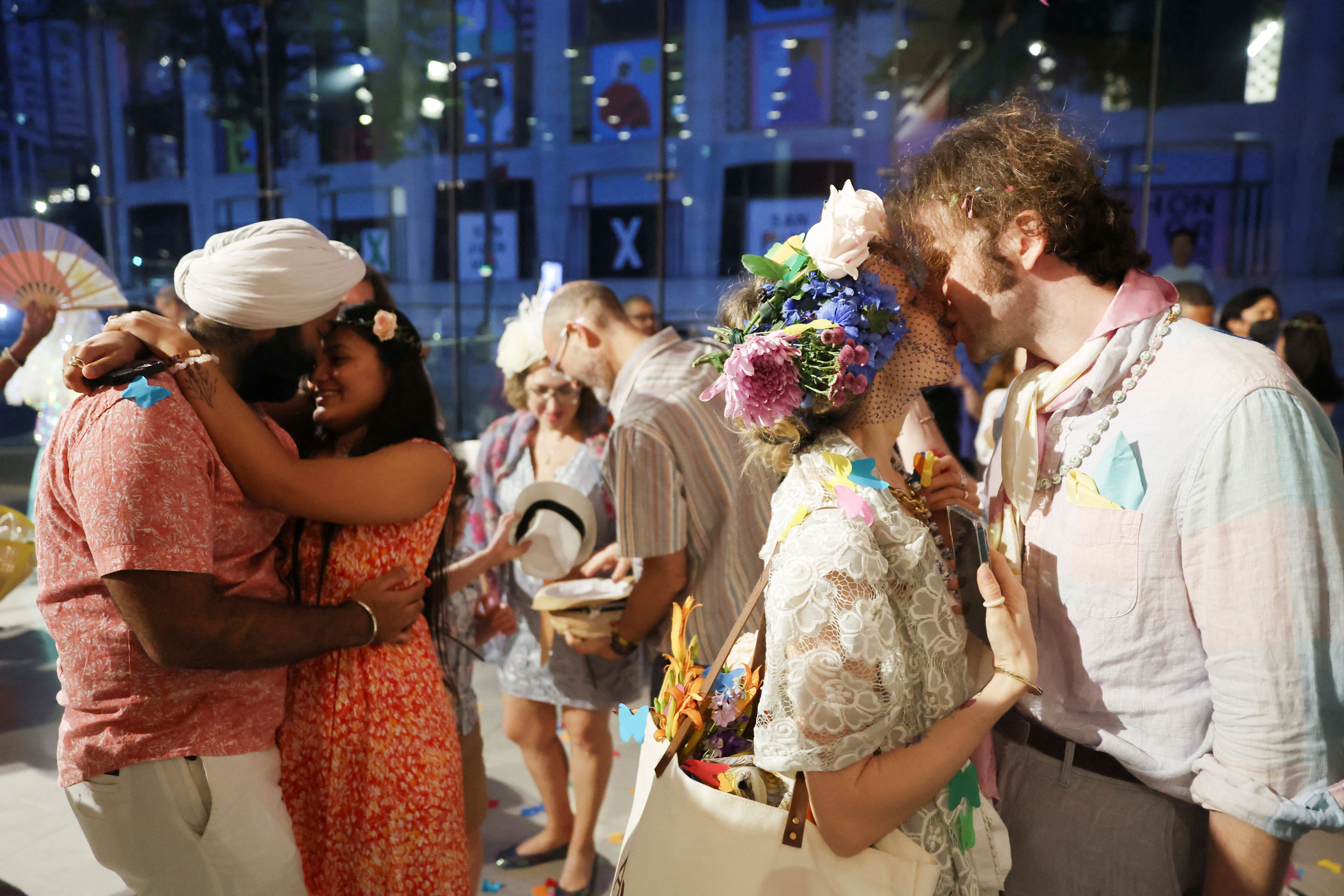 Couples kiss during “The Wedding: New York's Biggest Day”, an annual event that allows couples to celebrate their love at Lincoln Center in the Manhattan borough of New York City, U.S. June 21, 2025. (Photo by Heather Khalifa/Reuters)
