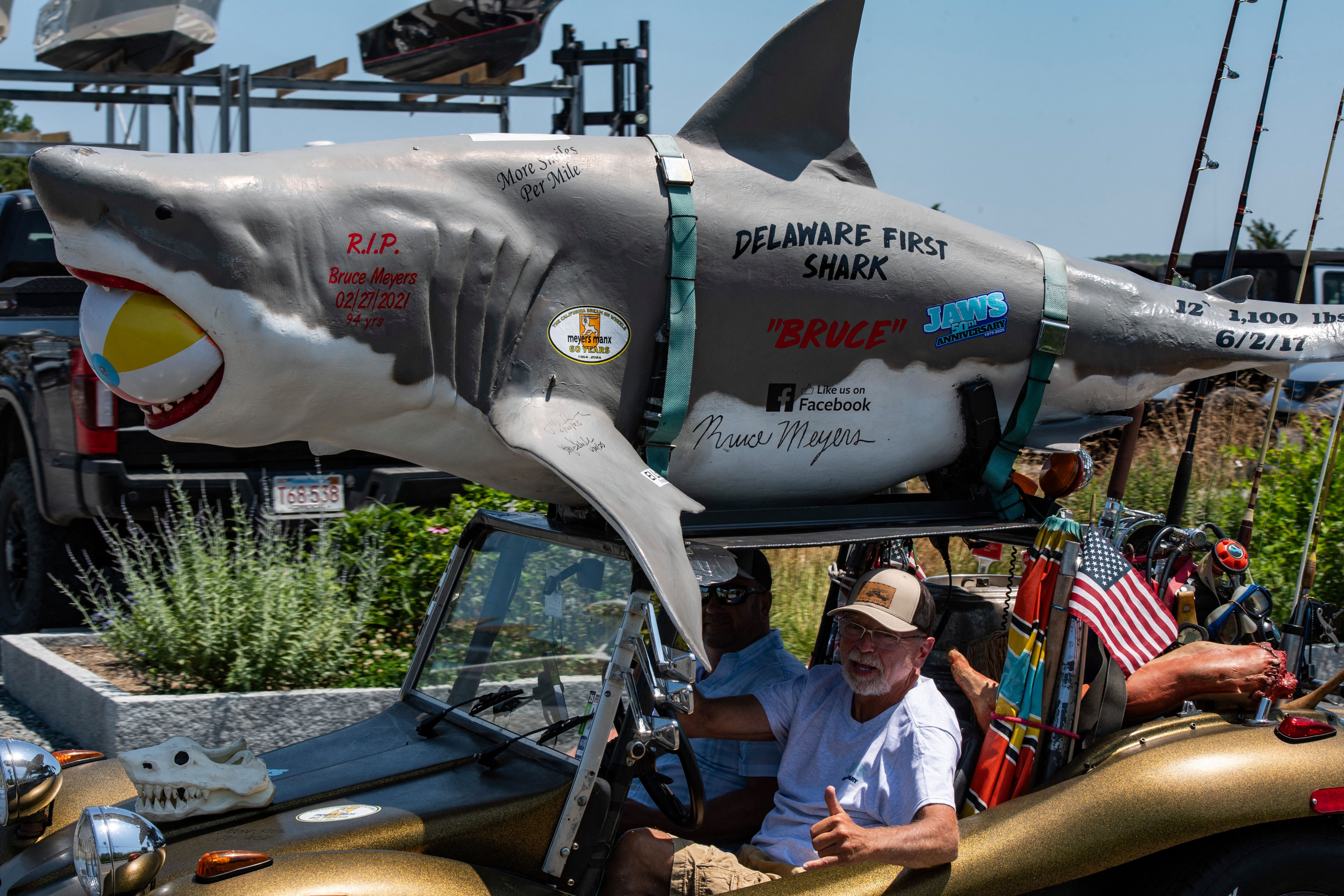 A person drives around the island in a dune buggy with a great white shark attached to the roof during the Jaws 50th Anniversary celebration in Oak Bluffs, Massachusetts on June 21, 2025. (Photo by Joseph Prezioso/AFP Photo)