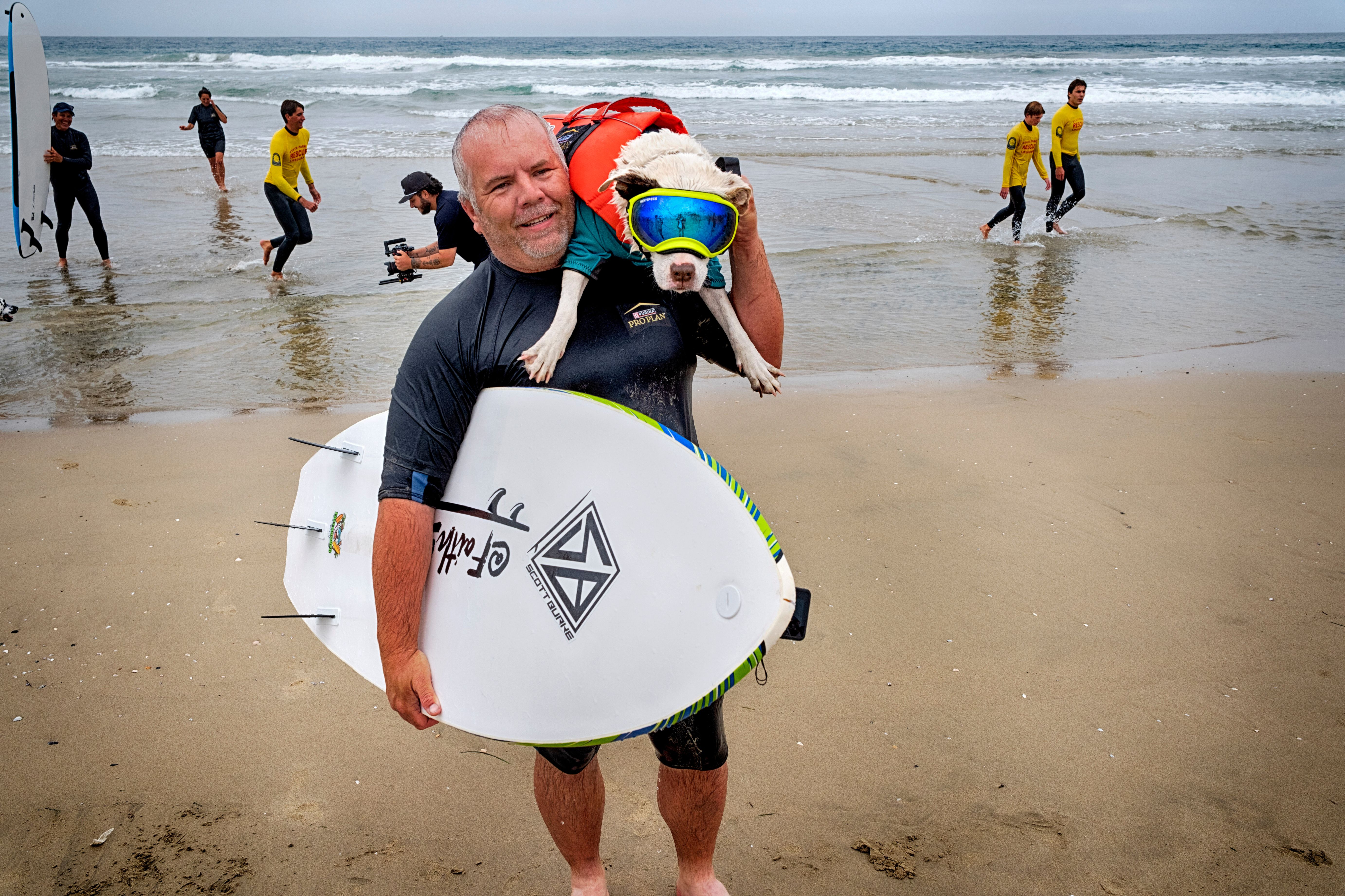 James Will carries his dog Faith, a 13-year-old partially blind and deaf American pit bull terrier, after competing in the annual Incredible Dog Challenge western regional surfing competition in Huntington Beach, Calif., Friday, June 20, 2025. (Photo by Richard Vogel/AP Photo)