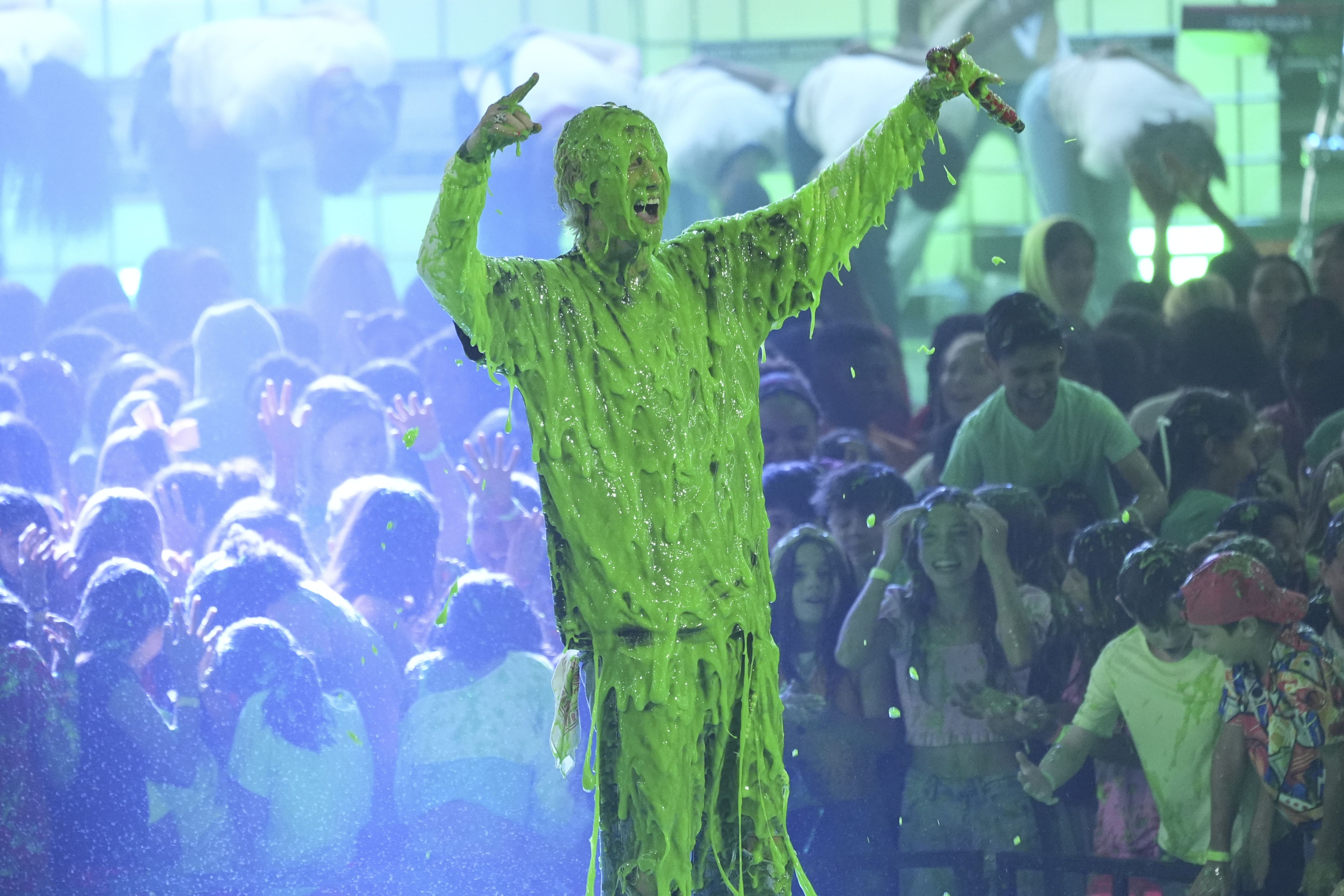 Machine Gun Kelly gets slimed after performing "Cliche" during the Nickelodeon Kids' Choice Awards on Saturday, June 21, 2025, at The Barker Hangar in Santa Monica, Calif. (Photo by Chris Pizzello/AP Photo)
