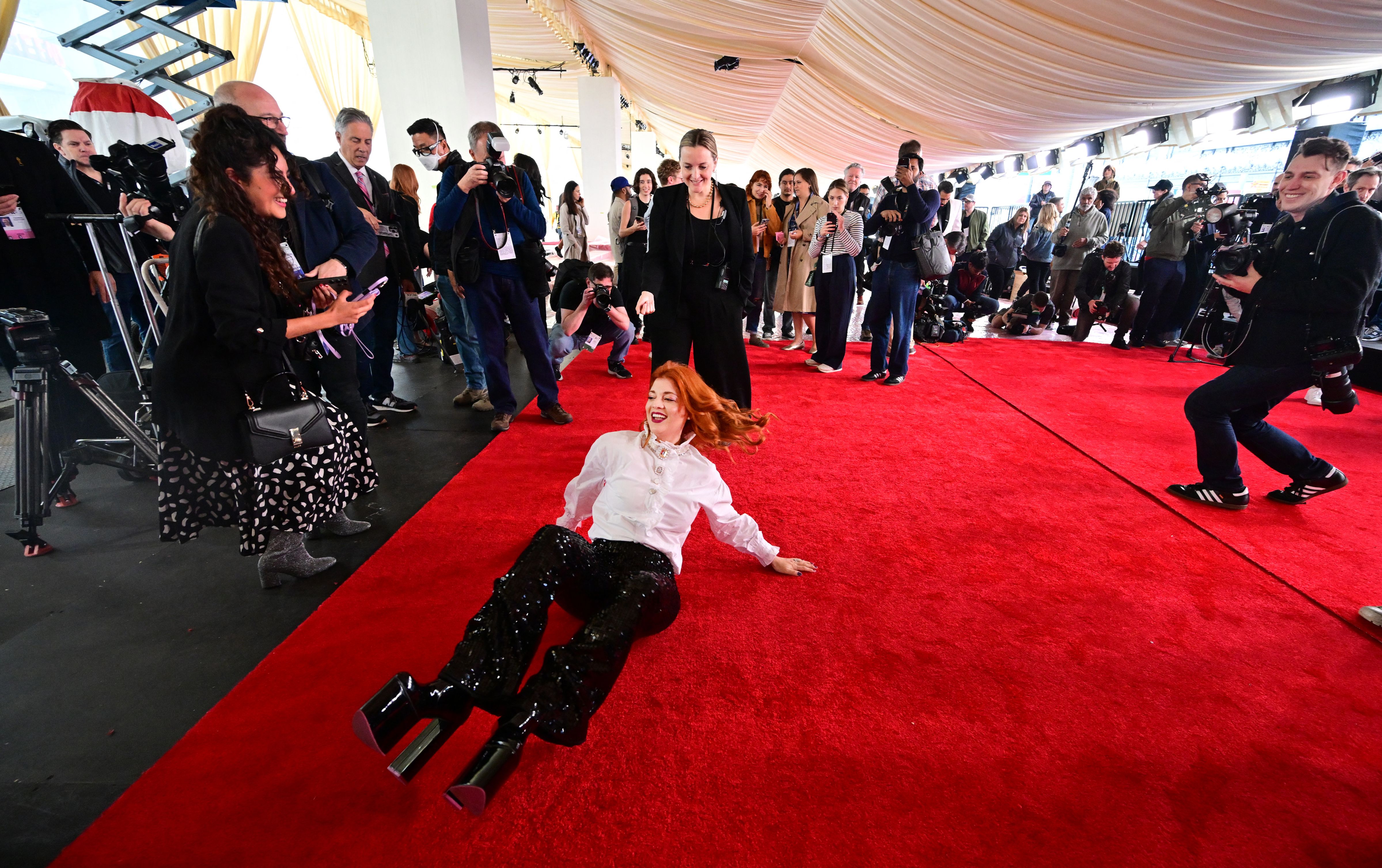 Actress Dakyta Daniela Aita rolls herself on the red carpet after its is rolled out ahead of the 96th Annual Academy Awards at the Dolby Theatre in Hollywood, California on March 6, 2024. The 96th Annual Academy Awards will be held on March 10. (Photo by Frederic J. Brown/AFP Photo)