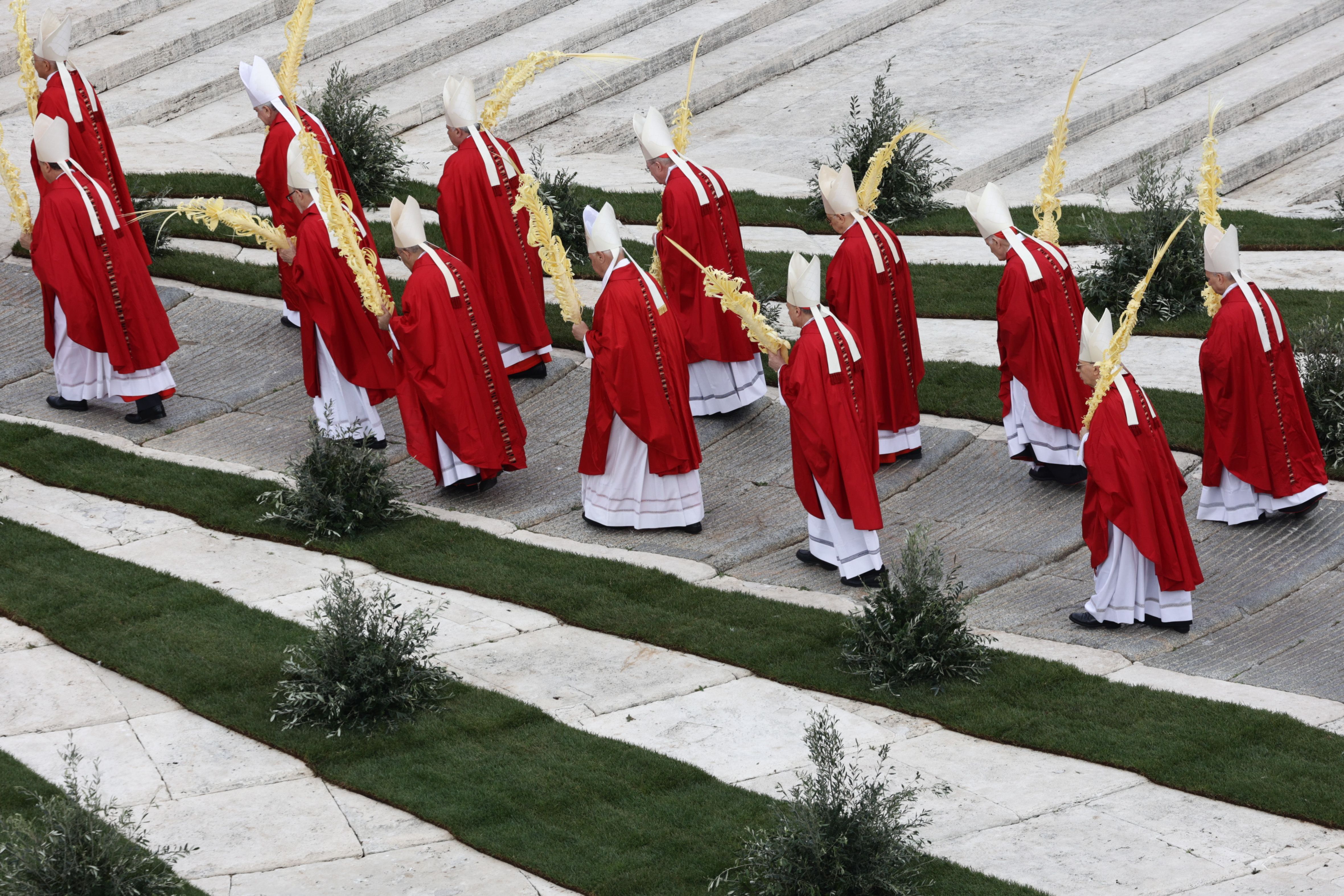 Bishops walk with palms during the Palm Sunday mass at Saint Peter's Square in Vatican on March 24, 2024. (Photo by Jakub Porzycki/NurPhoto/Rex Features/Shutterstock)