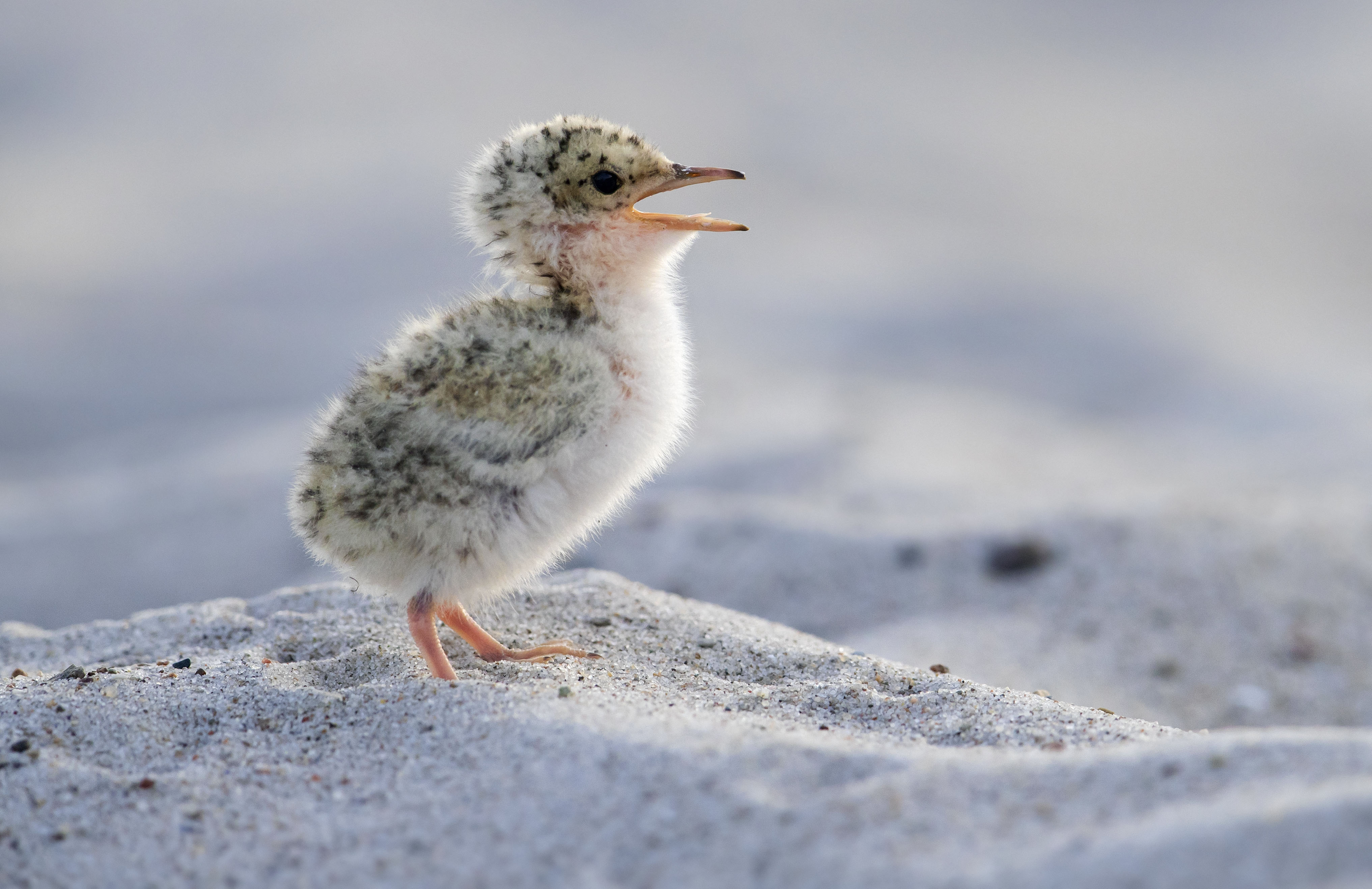 Cute little tern (Sternula albifrons/Sterna albifrons) chick on sandy beach calling in spring. (Photo by: Sven-Erik Arndt/Arterra/Universal Images Group via Getty Images)