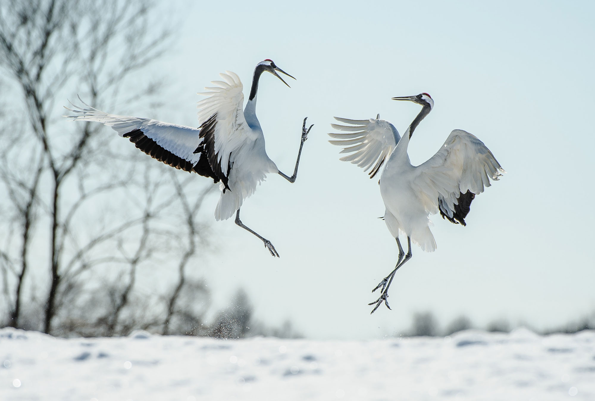 Two Japanese red-crowned cranes leap and dance, performing a courtship ritual in the snow. (Photo by Elmvilla/iStockphoto via Getty Images)