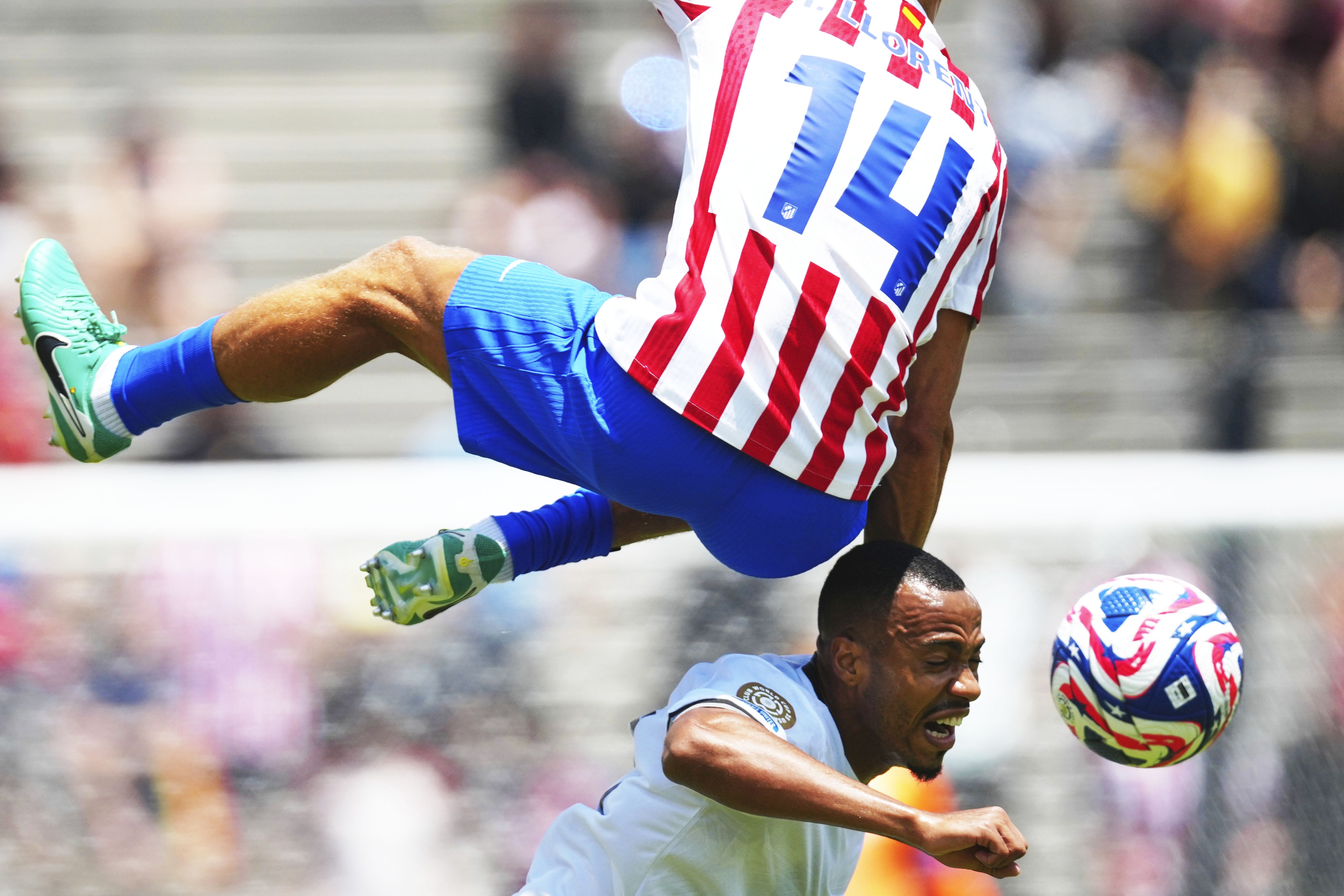 Botafogo's Marlon Freitas, bottom, heads a ball next to Atletico Madrid's Marcos Llorente during the Club World Cup Group B soccer match between Atletico Madrid and Botafogo in Pasadena, Calif., Monday, June 23, 2025. (Photo by Jae Hong/AP Photo)