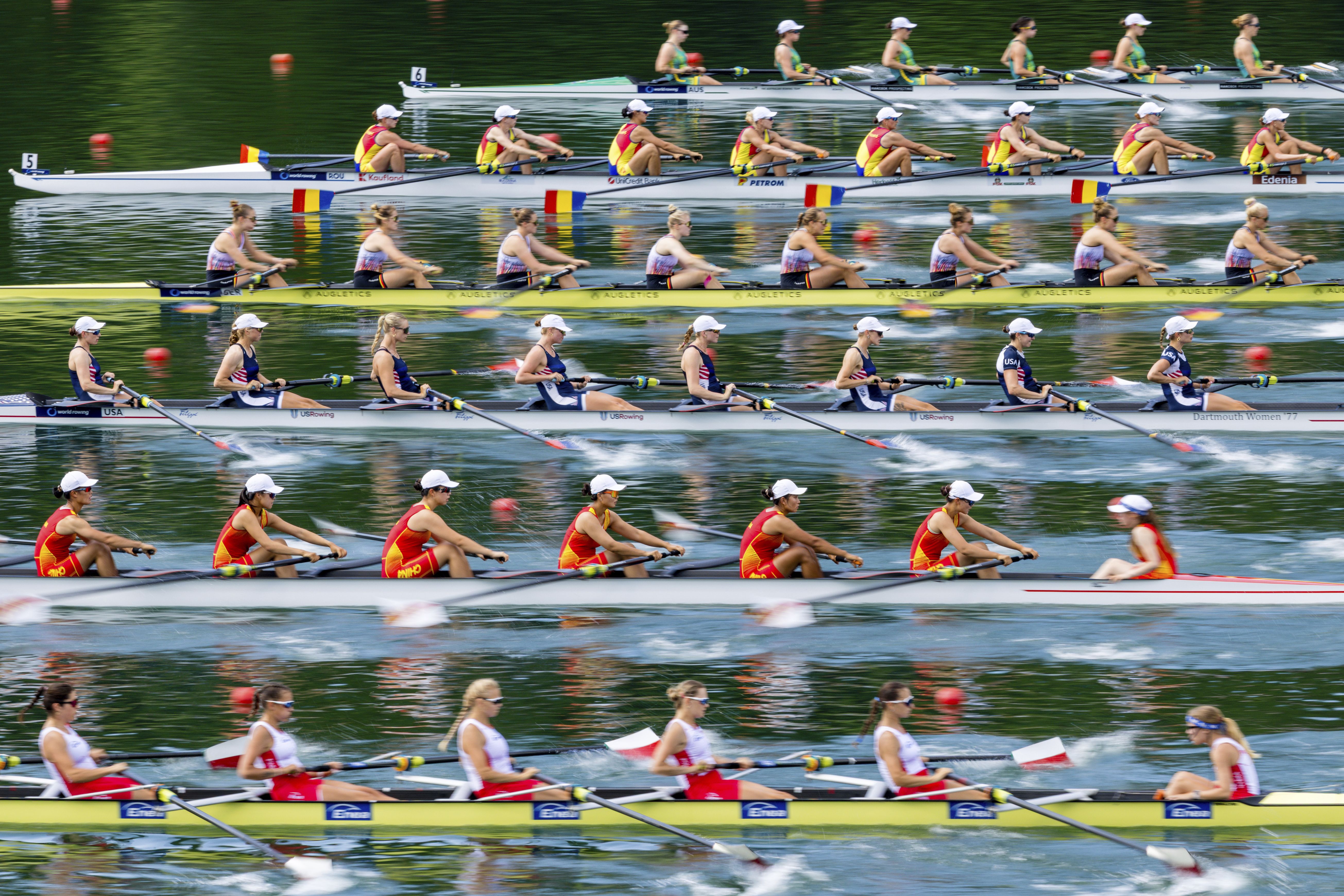 The teams of Australia, Romania, Germany, the United States, China and Poland, from top, compete in the Women's Eight preliminary race on the first day of the 2025 World Rowing Cup at Rotsee in Lucerne, Switzerland, on Friday, June 27, 2025. (Photo by Philipp Schmidli/Keystone via AP Photo)