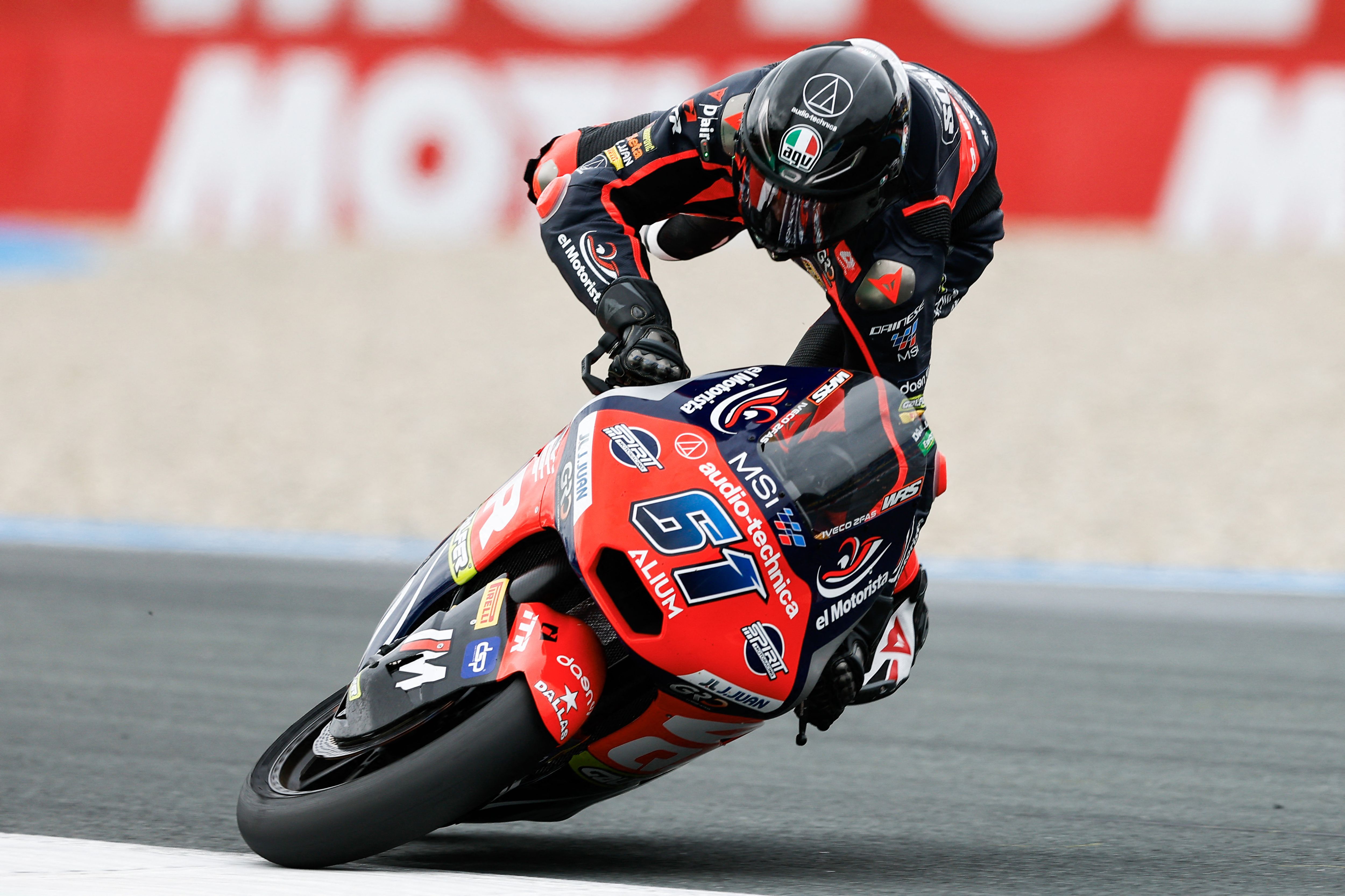 QJMotor-Frinsa-MSI team's Spanish Moto2 rider Eric Fernandez crashes takes a corner during a free practice ahead 2024 Netherlands Moto2 Grand Prix at the TT Circuit Assen, in Assen on June 27, 2025. (Photo by Vincent Jannink/ANP via AFP Photo)