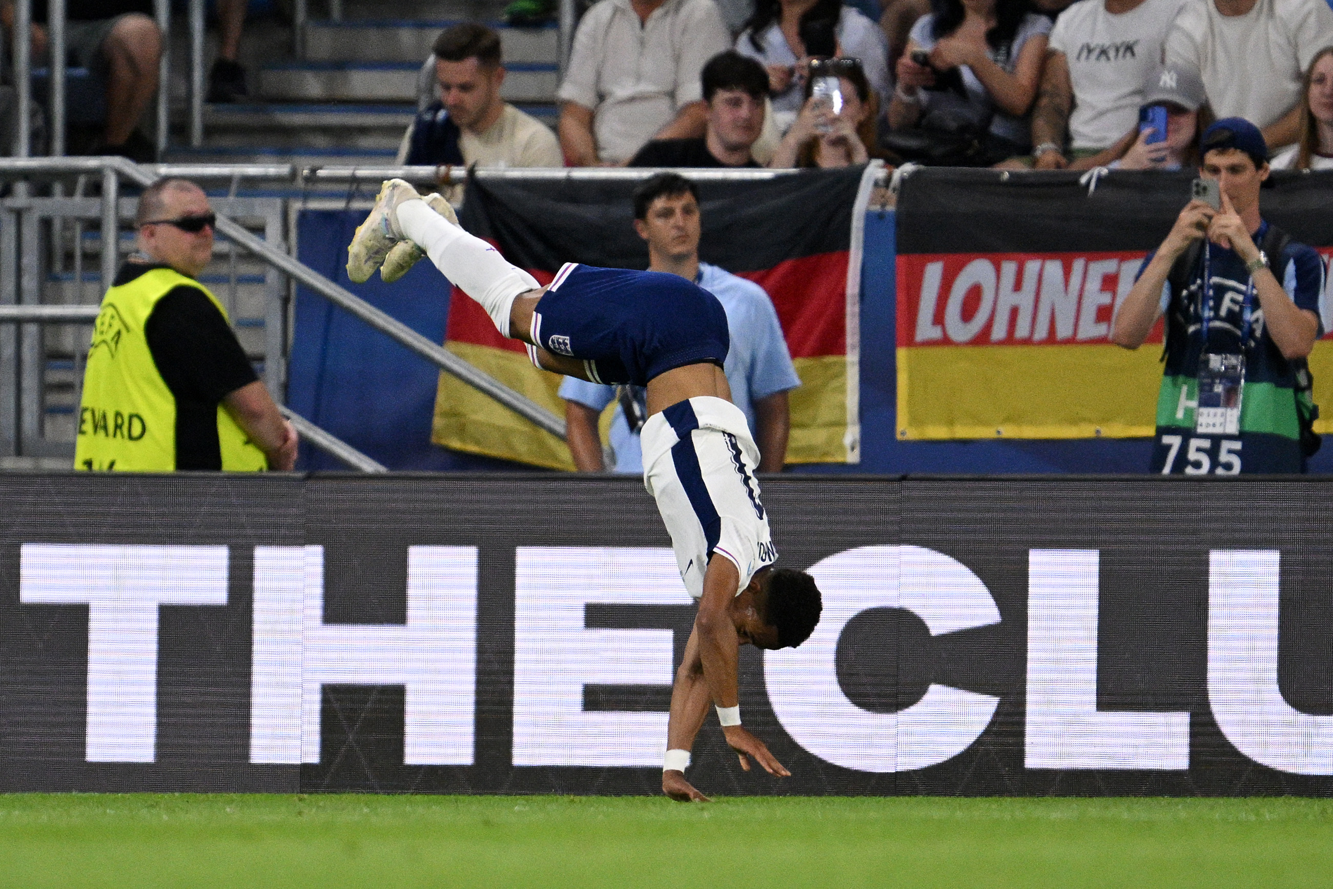 Omari Hutchinson of England celebrates scoring his team's second goal during the UEFA European Under-21 Championship 2025 Final match between England and Germany at National Football stadium on June 28, 2025 in Bratislava, Slovakia. (Photo by Tullio Puglia – UEFA/UEFA via Getty Images)