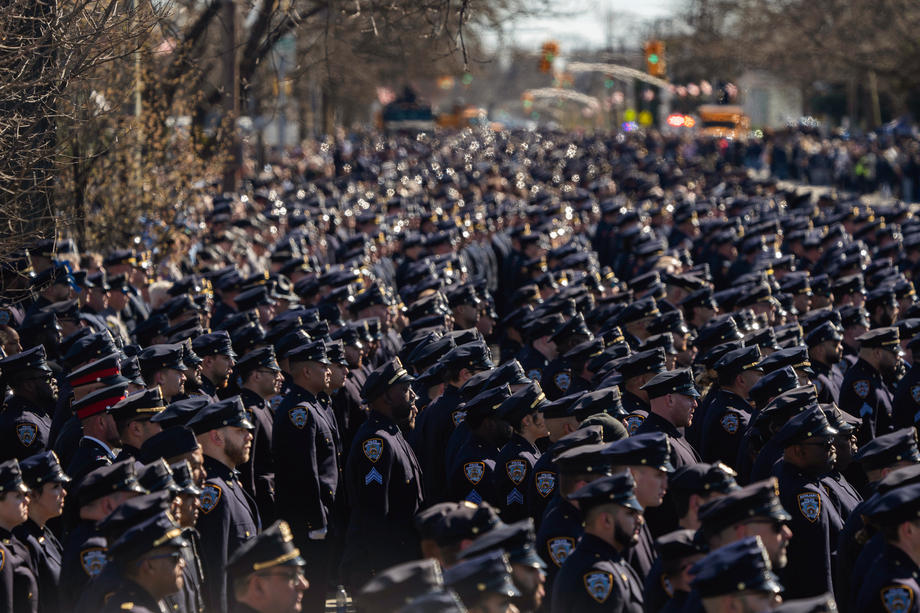 Police officers gather during a funeral service for New York City police officer Jonathan Diller, oiutside the Saint Rose of Lima R.C Church in Massapequa Park, N.Y., March 30, 2024. Diller, 31, who was shot dead during a traffic stop, was the first New York City police officer killed in the line of duty in two years. (Photo by Jeenah Moon/AP Photo)