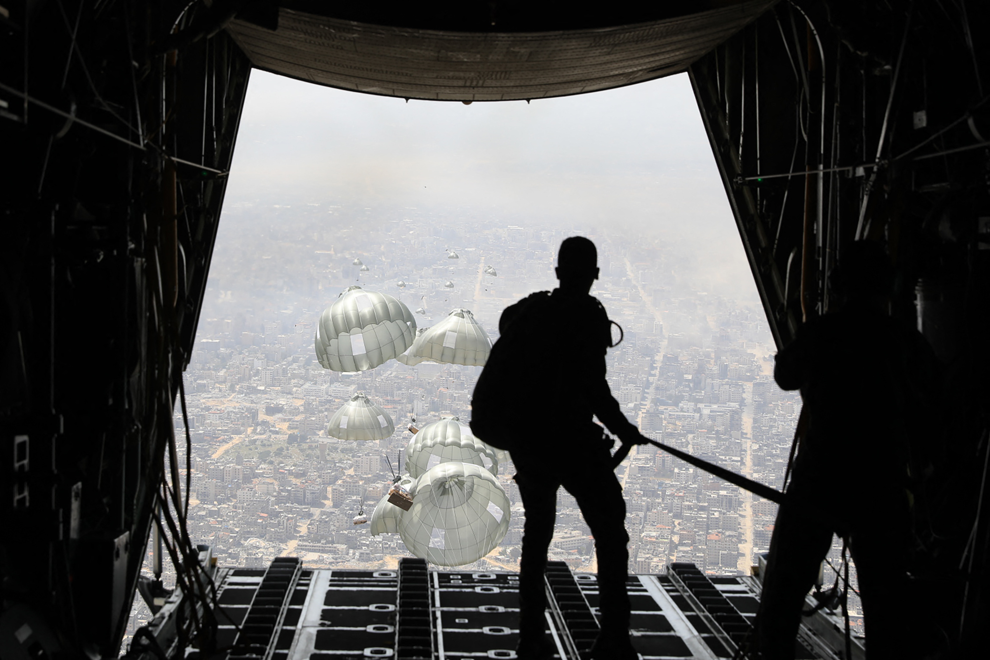 This handout picture released by the Jordanian army on March 31, 2024, shows humanitarian aid being airdropped from a military aircraft over the northern Gaza Strip, amid ongoing battles between Israel and the Palestinian militant group Hamas. The Jordanian Army said in a statement on March 31 that two Jordanian C-130 aircraft, four US planes, and others from Britain, Germany Egypt and the United Arab Emirates carried out aid airdrops over northern Gaza. (Photo by Jordanian army/AFP Photo)