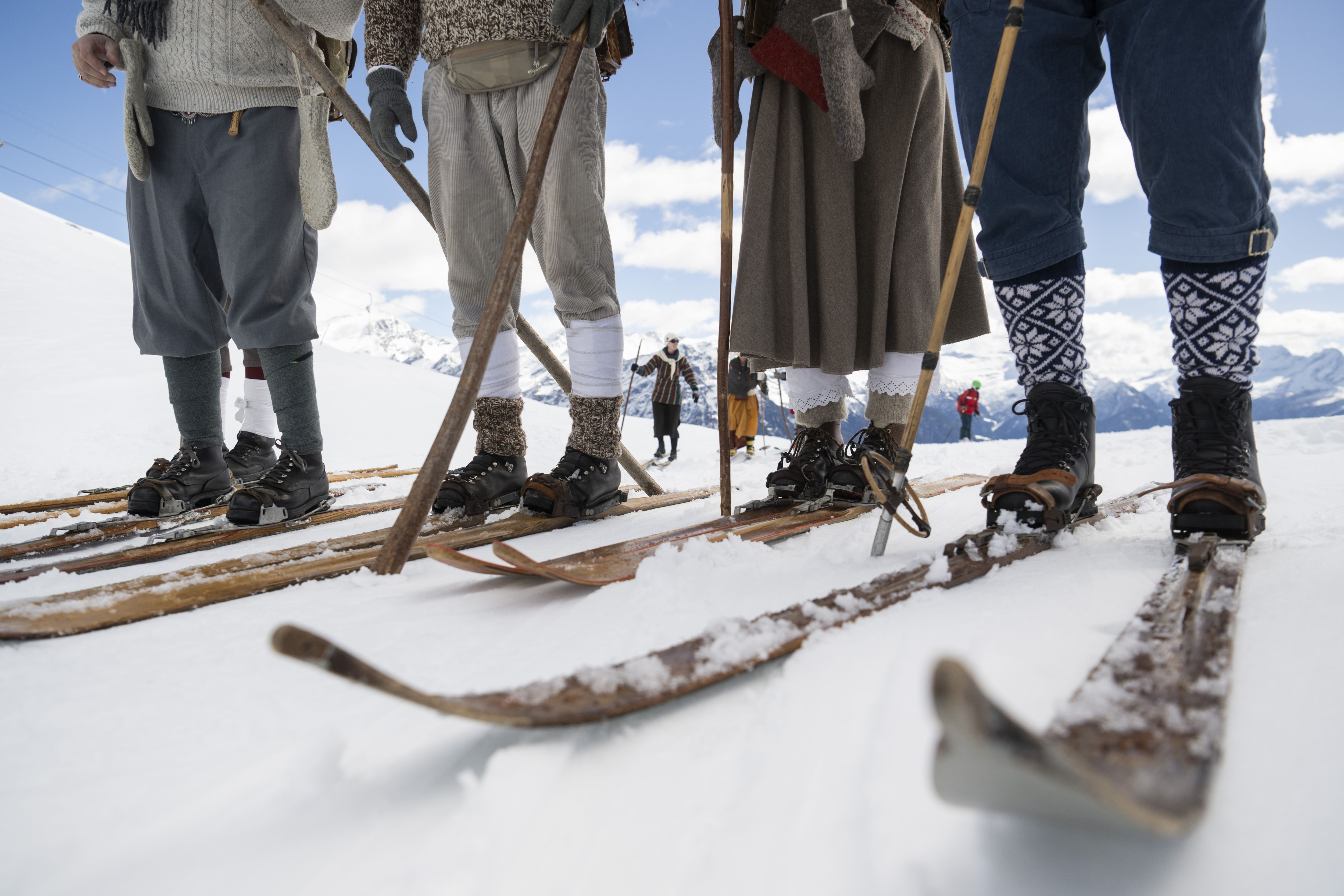 Skiers in historical costumes on old wooden skis on the slope take part in Telemarkada in the small Ticino ski resort of Nara in Leontica in the Blenio Valley, Switzerland, 16 March 2024. The Telemarkada has been held in the Blenio Valley for several years at the end of the season. (Photo by Alessandro Crinari/TI-Press via EPA/EFE)