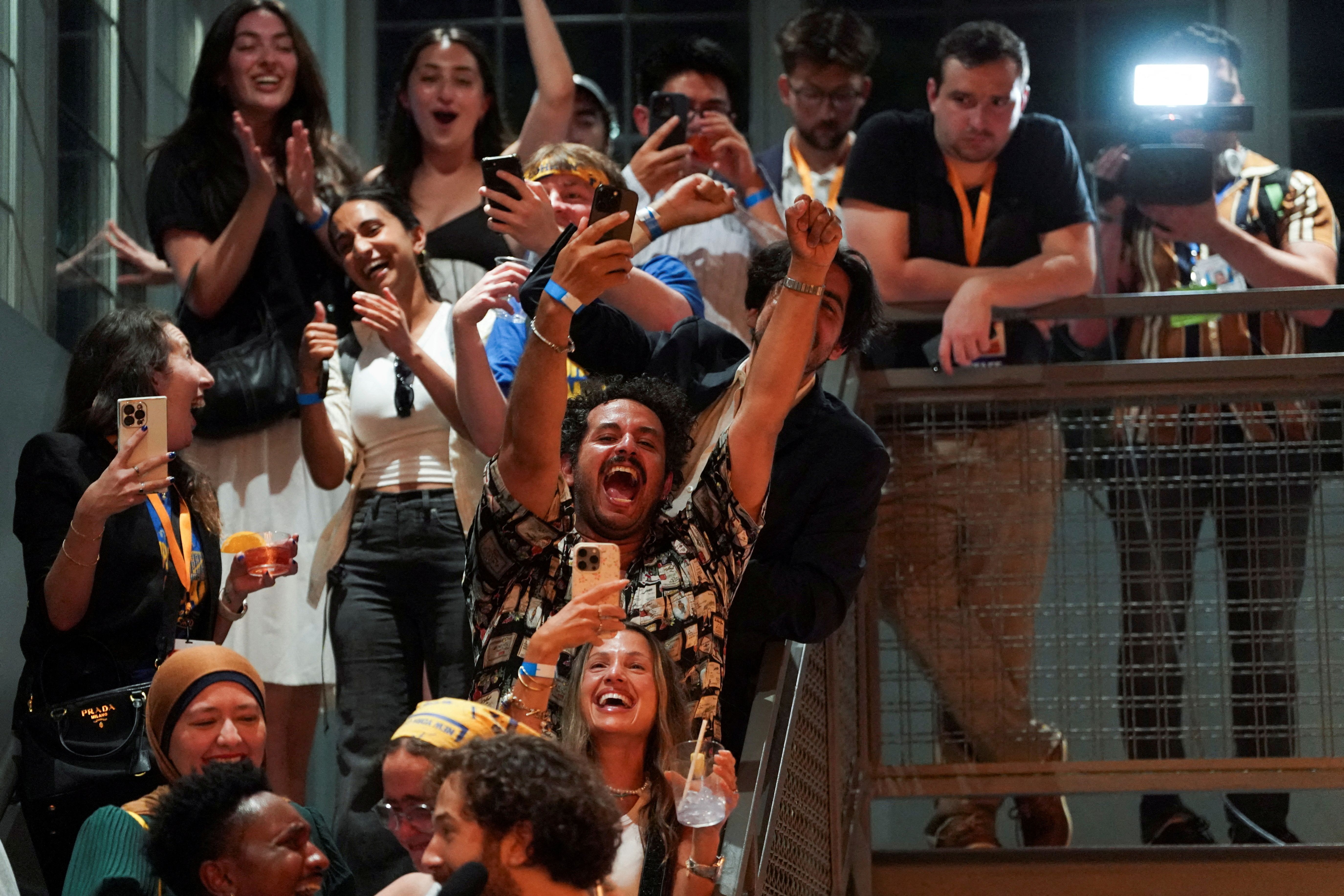 Supporters react during a watch party for Zohran Mamdani's primary election, which includes his bid to become the Democratic candidate for New York City mayor in the upcoming November 2025 election, in New York City, on June 24, 2025. (Photo by David 'Dee' Delgado/Reuters)