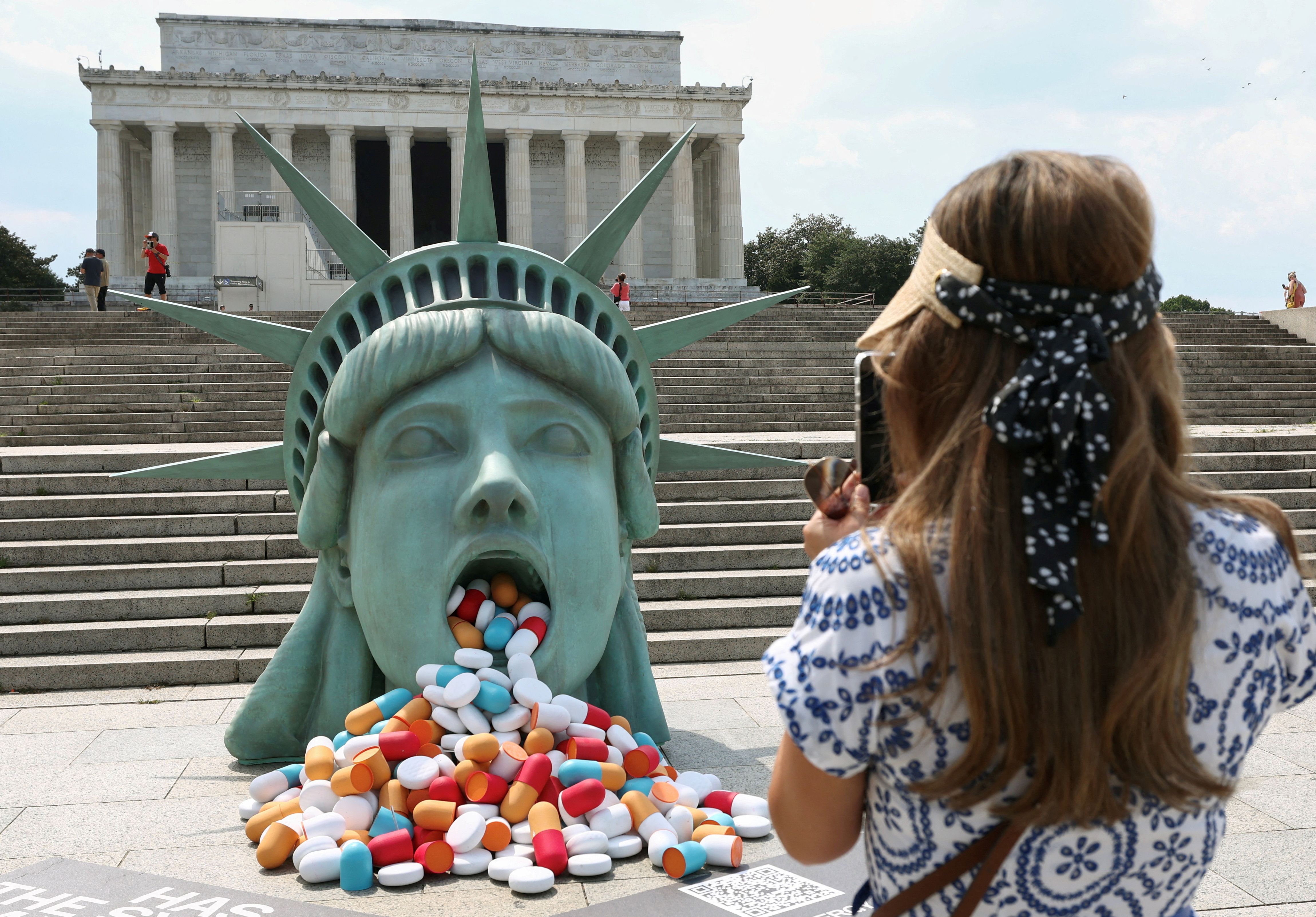 A visitor takes a photo of an art installation titled “Lady Liberty's Mouth of America”, a campaign by supplement company Vimergy, aimed at sparking conversation in the nation's capital about focusing on preventive health and an end to the alleged over-reliance on prescription drugs, in front of the Lincoln Memorial in Washington, D.C., U.S., June 25, 2025. (Photo by Kevin Lamarque/Reuters)