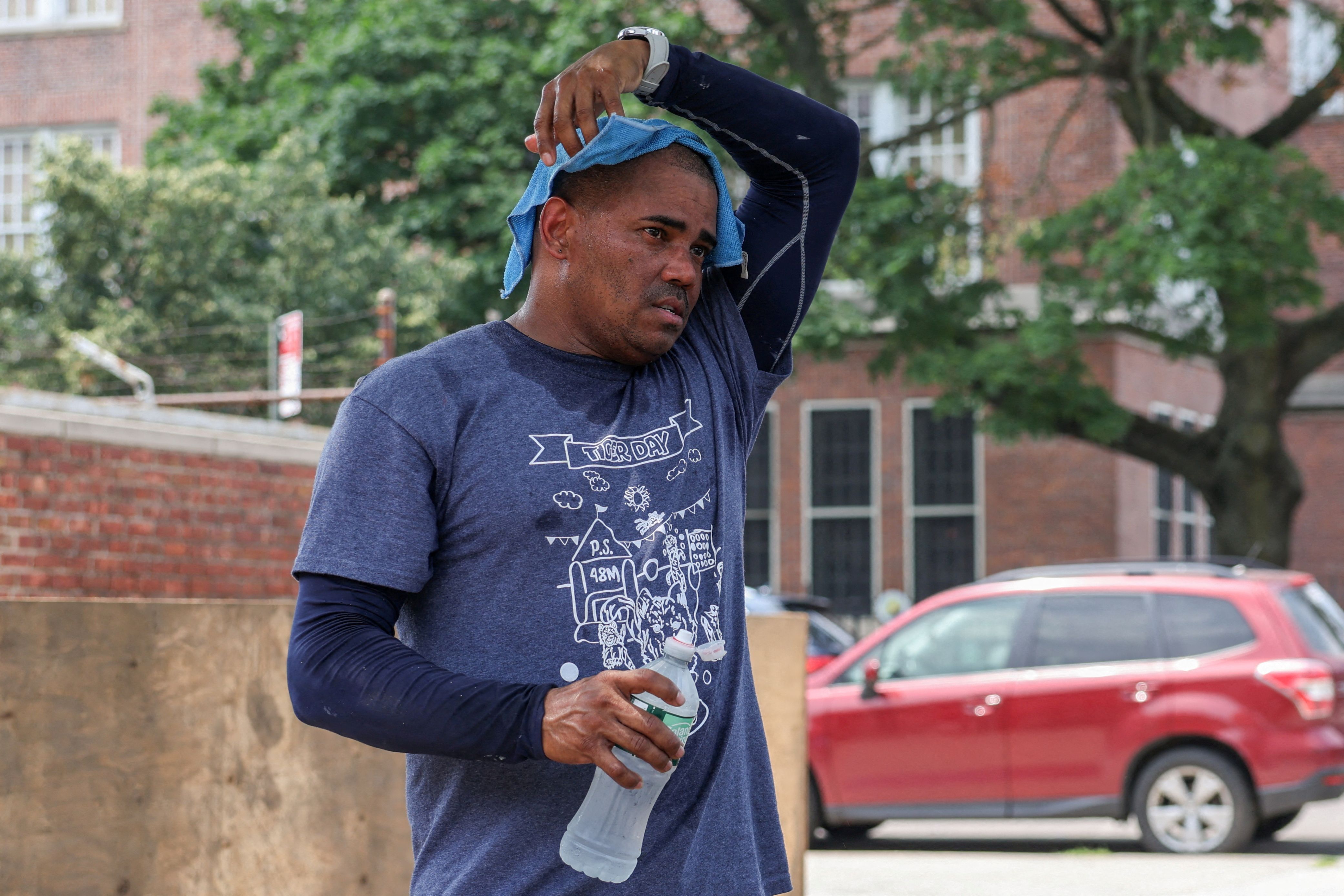 A landscaper puts a cold towel over his head as an extreme heat warning is in effect in Queens, New York City on June 23, 2025. (Photo by Kylie Cooper/Reuters)