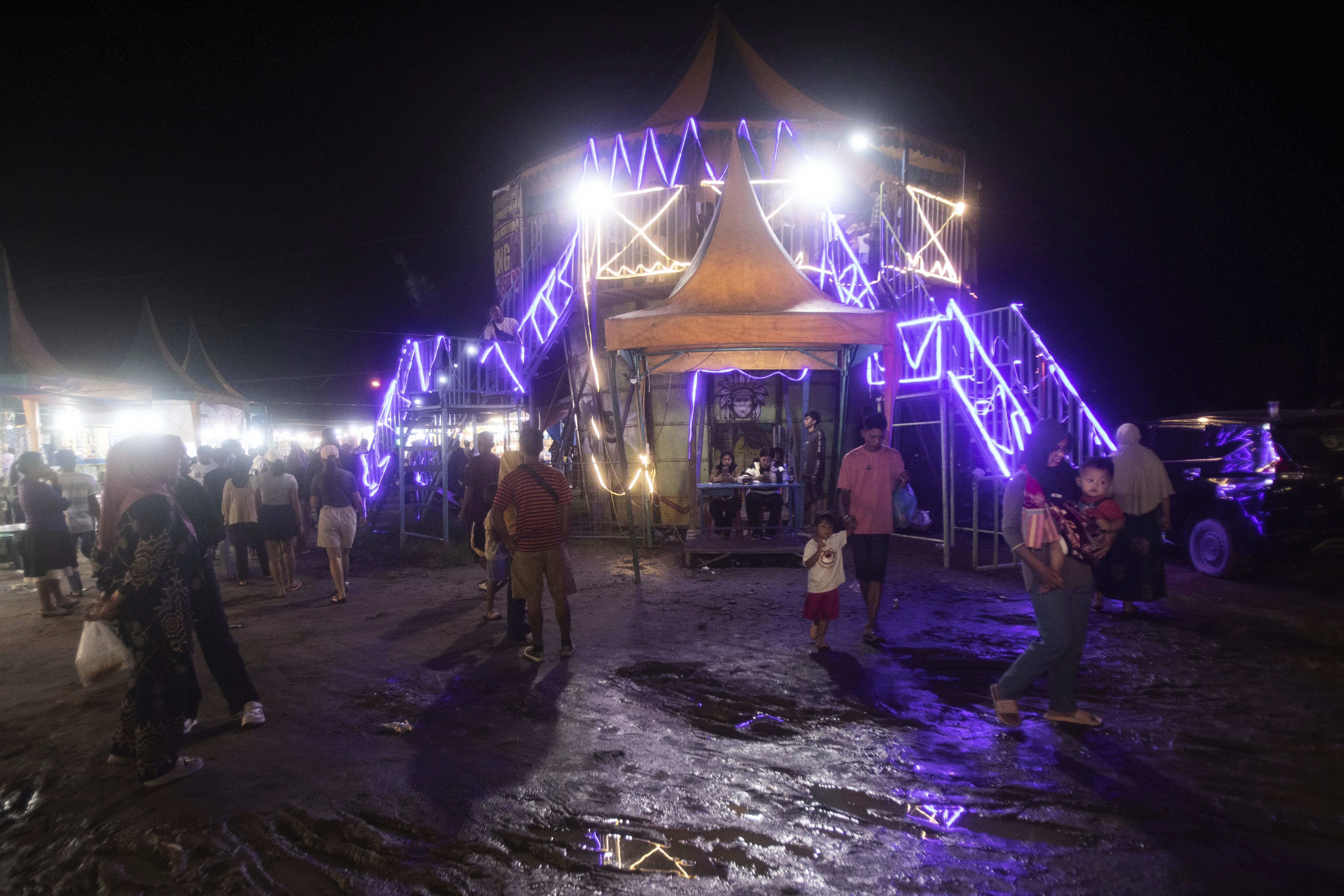 Sri Wahyuni, also known as Ayu, center, sits at the ticket desk before performing in a “wall of death”, locally known as “tong setan” or satan's barrel, at a fairground in Medan, North Sumatra, Indonesia, Saturday, May 10, 2025. (Photo by Binsar Bakkara/AP Photo)