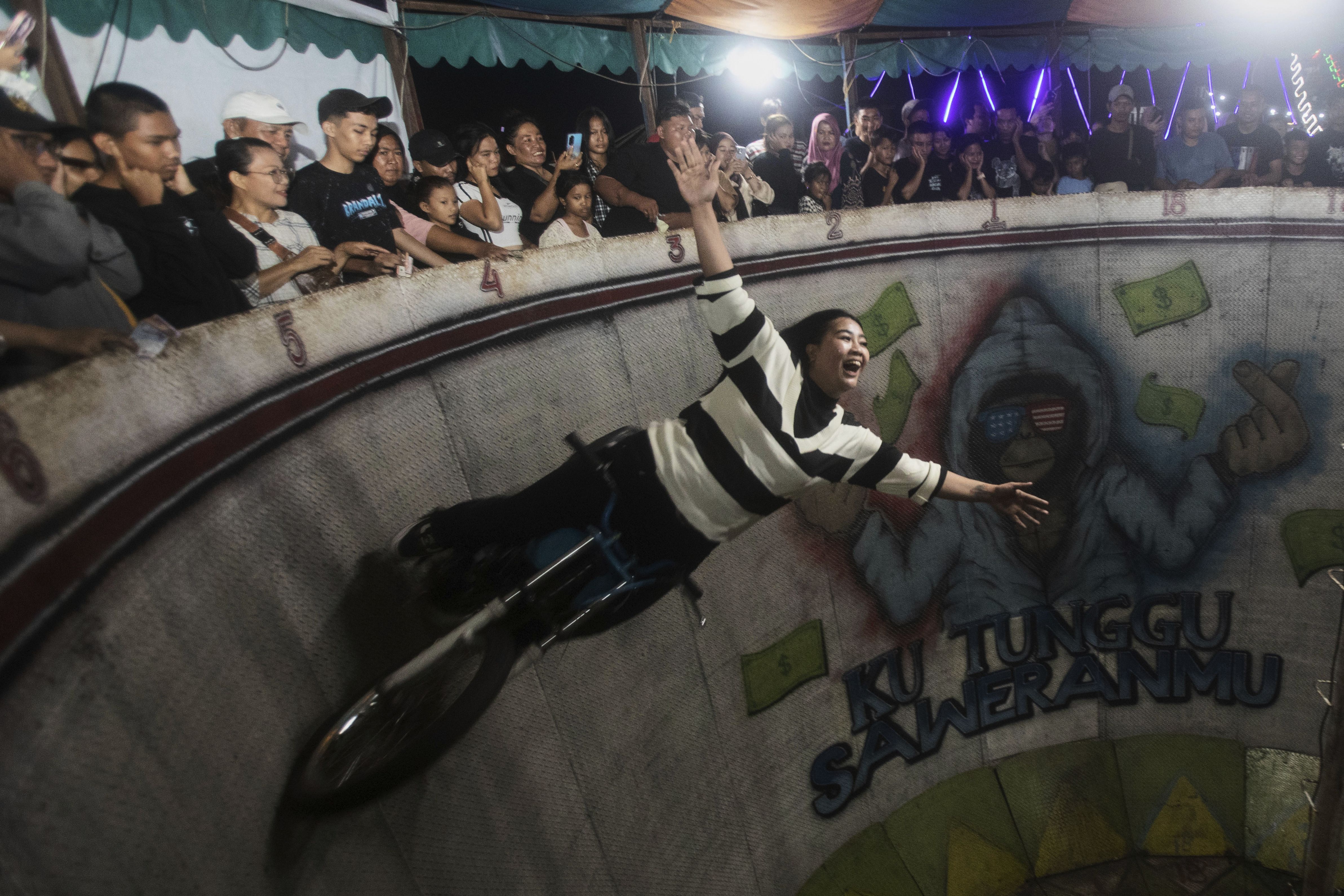 Sri Wahyuni, also known as Ayu, performs in the “wall of death”, locally known as “tong setan” or satan's barrel, at a fairground in Medan, North Sumatra, Indonesia, Saturday, May 10, 2025. (Photo by Binsar Bakkara/AP Photo)