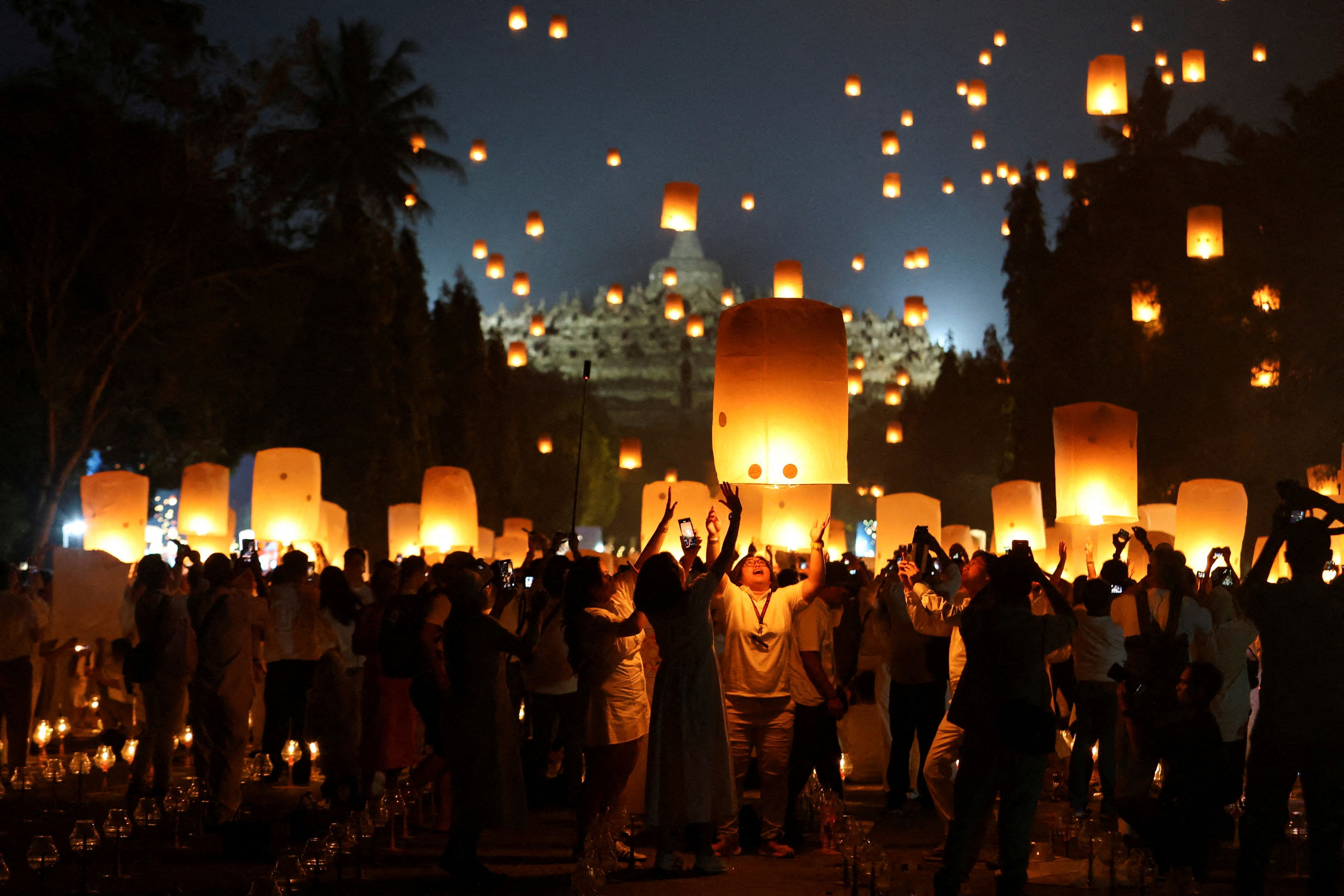 People release paper lanterns during a ceremony on Vesak Day, an annual celebration of the Buddha's birth, enlightenment, and passing, at Borobudur temple in Magelang, Central Java province, Indonesia, on May 12, 2025. (Photo by Dwi Oblo/Reuters)