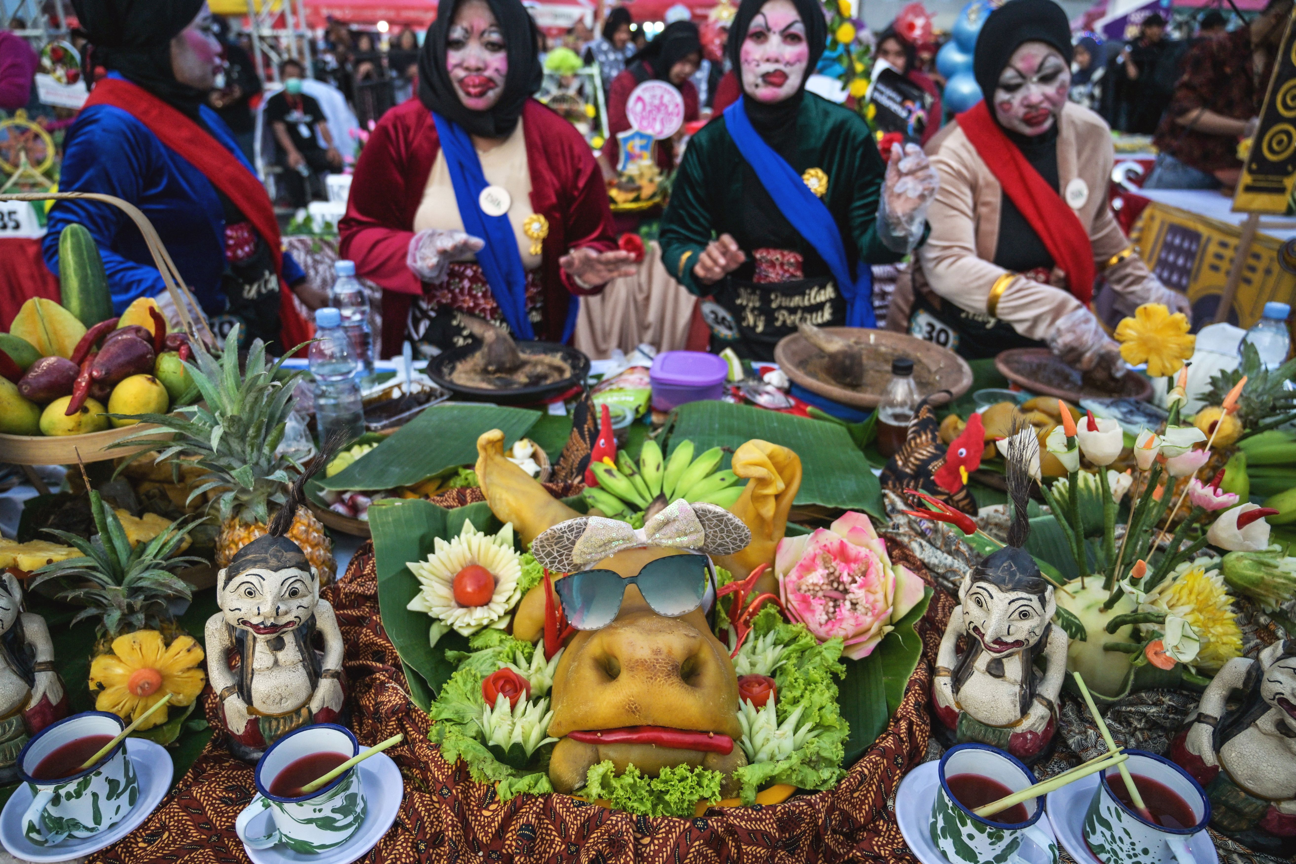 Participants in fancy costume event prepare Rujak Uleg, a traditional savoury salad which features beef muzzle and vegetables including cucumber, bean sprouts, spinach and other toppings mixed with peanut sauce, during the History of Rujak Uleg festival in Surabaya on May 17, 2025. (Photo by Juni Kriswanto/AFP Photo)