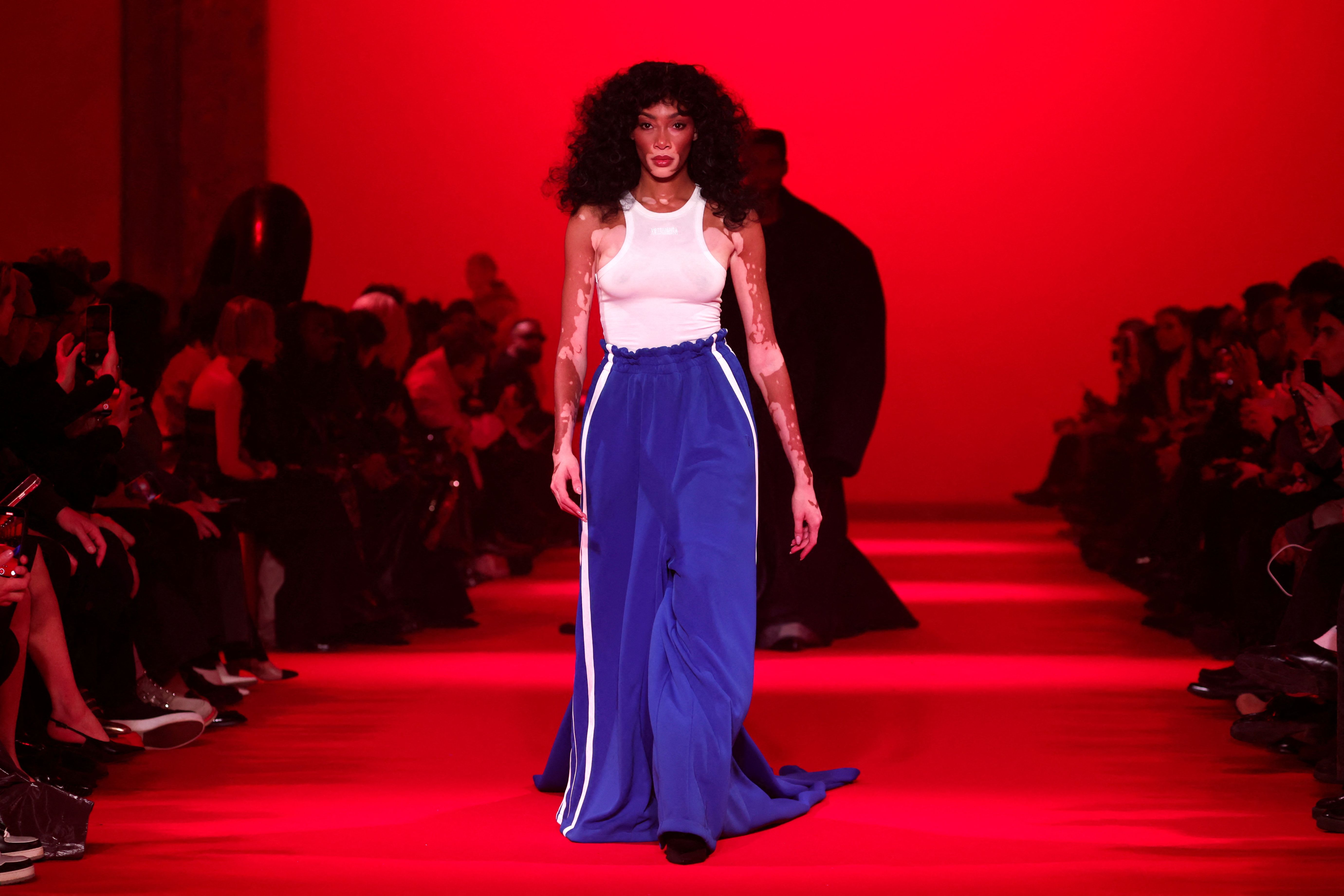 Canadian fashion model Winnie Harlow presents a creation by designer Guram Gvasalia as part of his Fall-Winter 2024/2025 Women's ready-to-wear collection show for Vetements label during Paris Fashion Week in Paris, France, on March 1, 2024. (Photo by Gonzalo Fuentes/Reuters)