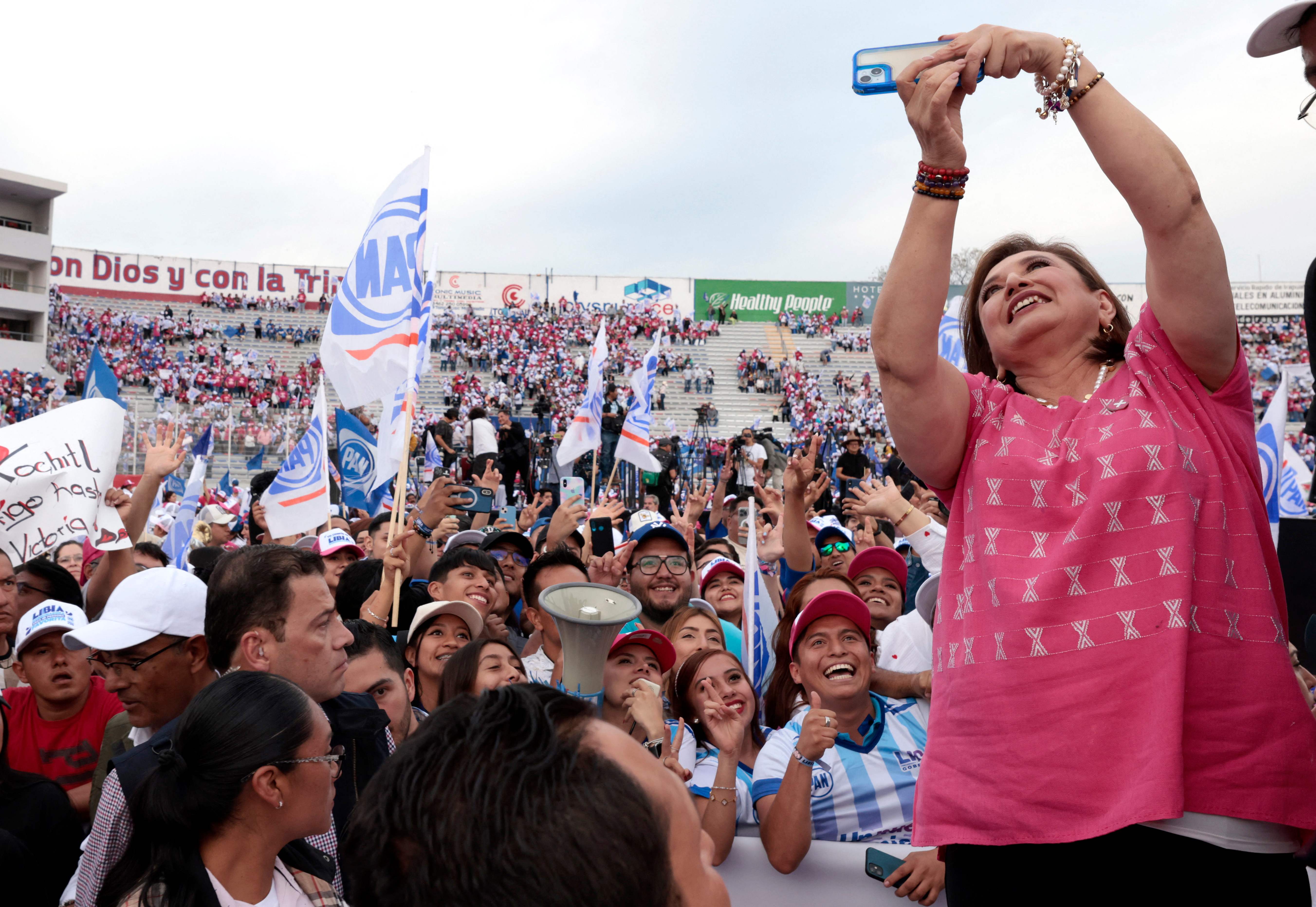 Mexico's opposition presidential candidate, Xóchitl Gálvez of the Fuerza y Corazón por México coalition party, takes a selfie with supporters at a campaign kick-off rally in Irapuato, Guanajuato State, Mexico, on March 1, 2024. Campaigning officially began Friday for elections likely to produce Mexico's first woman president – a watershed for a nation with a long tradition of macho culture. Opposition candidate Xochitl Galvez launched her campaign after the stroke of midnight in one of Mexico's most dangerous states, seeking to tap into voter concerns about the country's rampant violence. (Photo by Ulises Ruiz/AFP Photo)