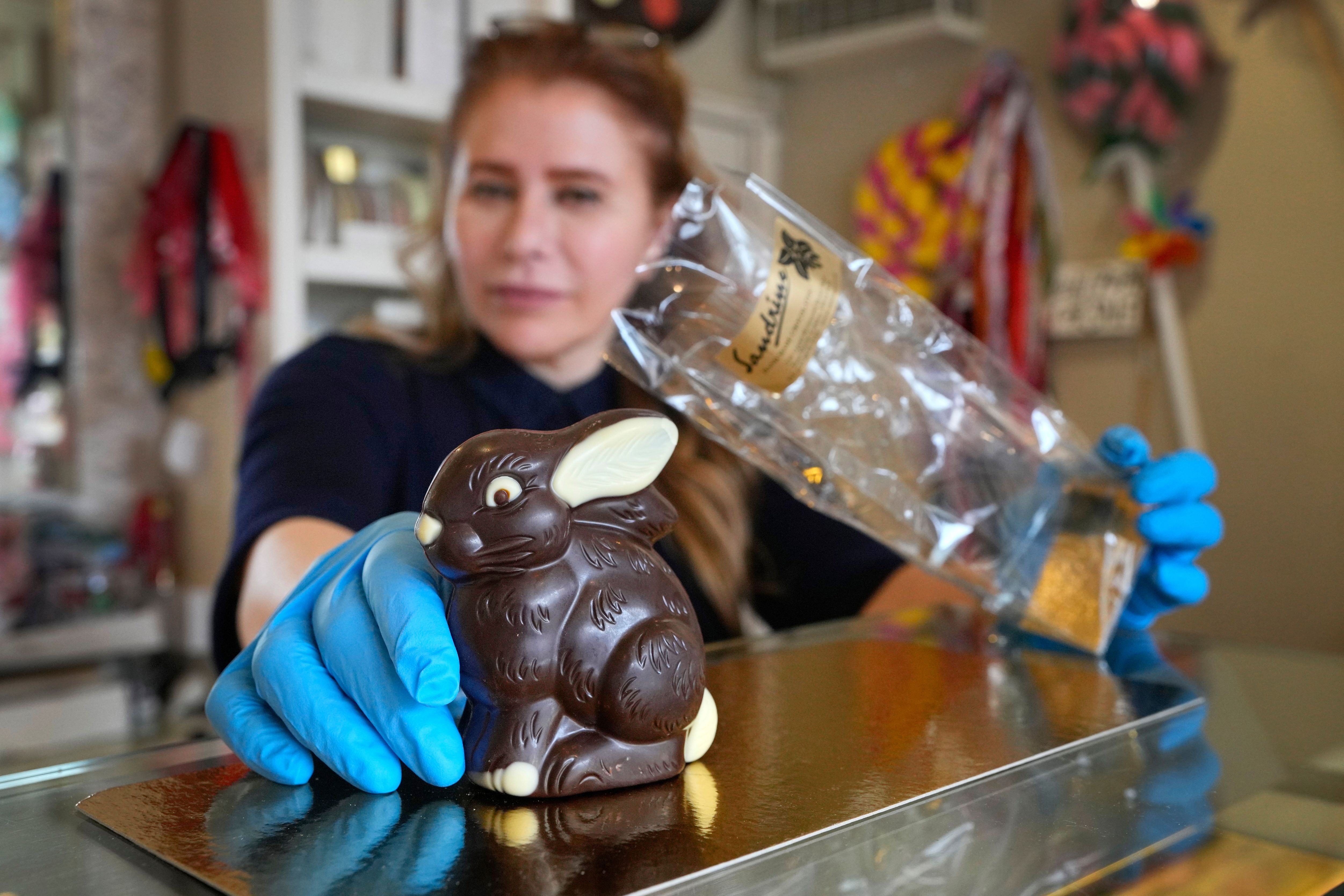 Niaz Mardan wraps a luxury handmade Belgian chocolate rabbit at Sandrine a chocolate shop in south west London, Thursday, March 21, 2024. Niaz Mardan, is suffering due to high cocoa prices, she's making no profits and fears she will have to close the shop that's been around for 25 years (she's the third owner and took over in 2019). (Photo by Kirsty Wigglesworth/AP Photo)