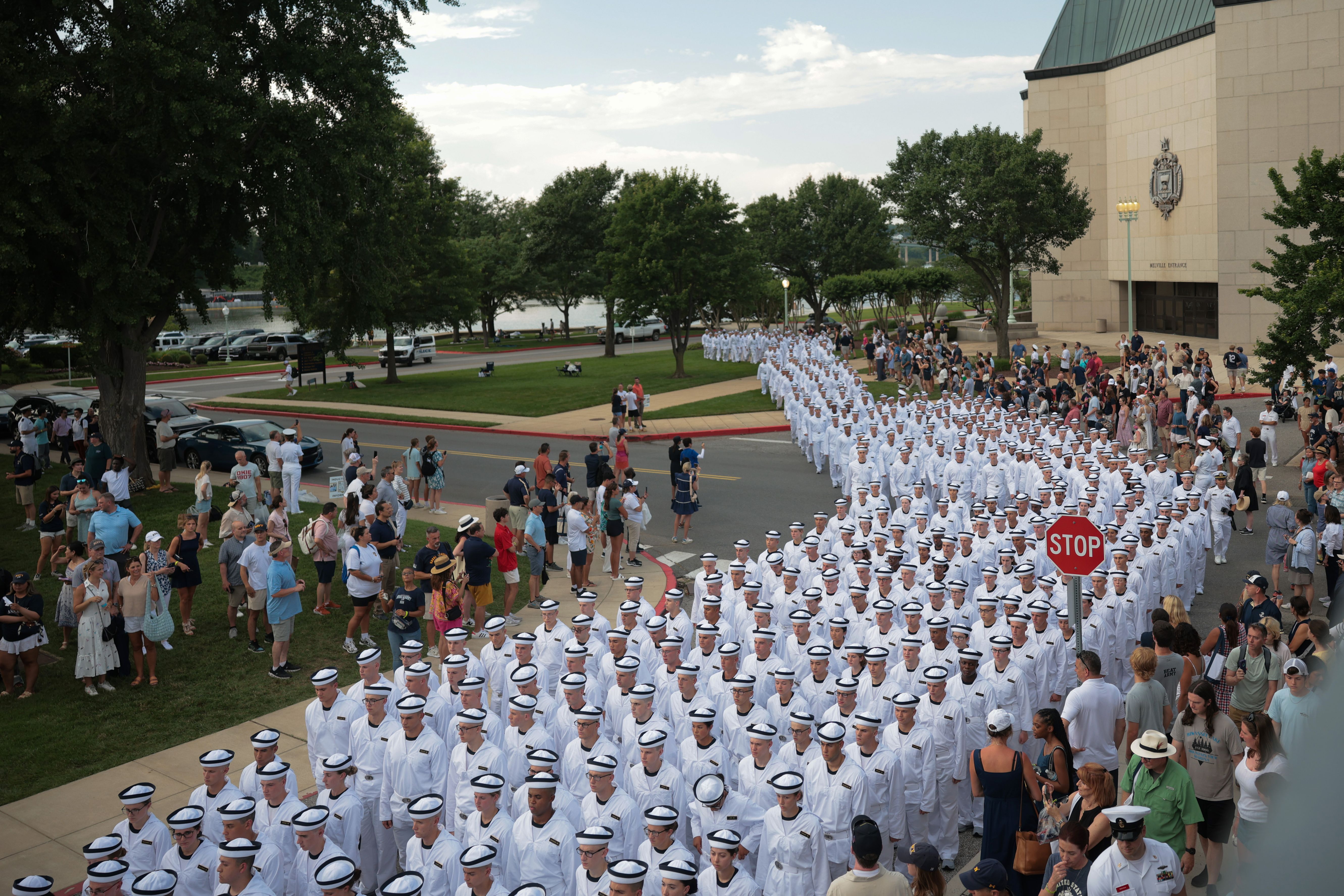 Incoming freshmen march to Worden Field for their Oath of Office ceremony during Induction Day at the U.S. Naval Academy on June 26, 2025 in Annapolis, Maryland. To mark the start of Plebe Summer, approximately 1,200 plebes, or freshmen in the Class of 2029 take part in Induction Day which involves In-processing, medical exams, uniform fittings, haircuts, and learning to salute. (Photo by Kayla Bartkowski/Getty Images)