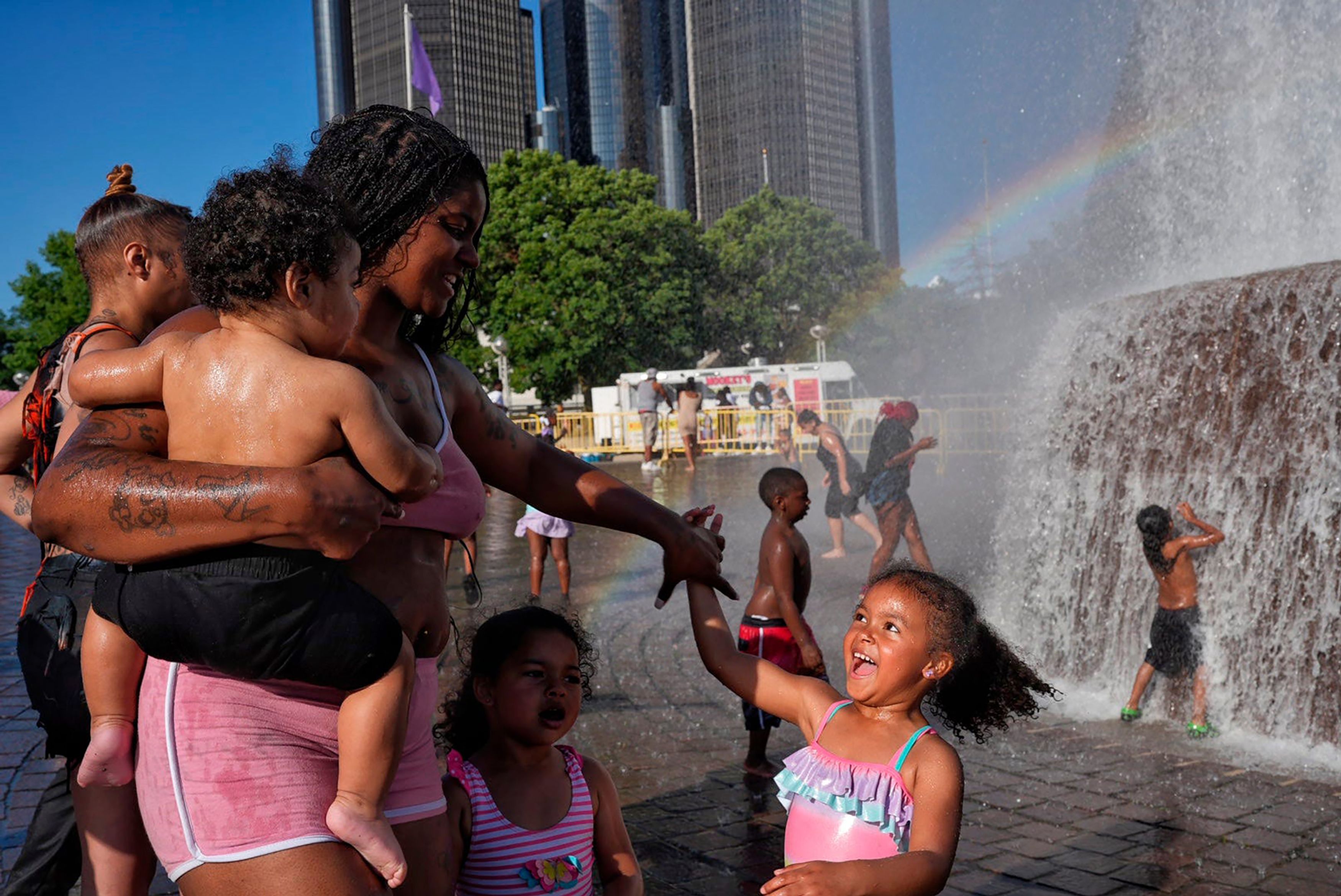 Kiara Daniels holds her son Kayson while twirling her daughter, Kehlani, at the Dodge Fountain in downtown Detroit’s Hart Plaza on Monday, June 23, 2025. They were waiting for the start of a fireworks show. (Photo by Ryan Garza/USA Today Network/Imagn Images)
