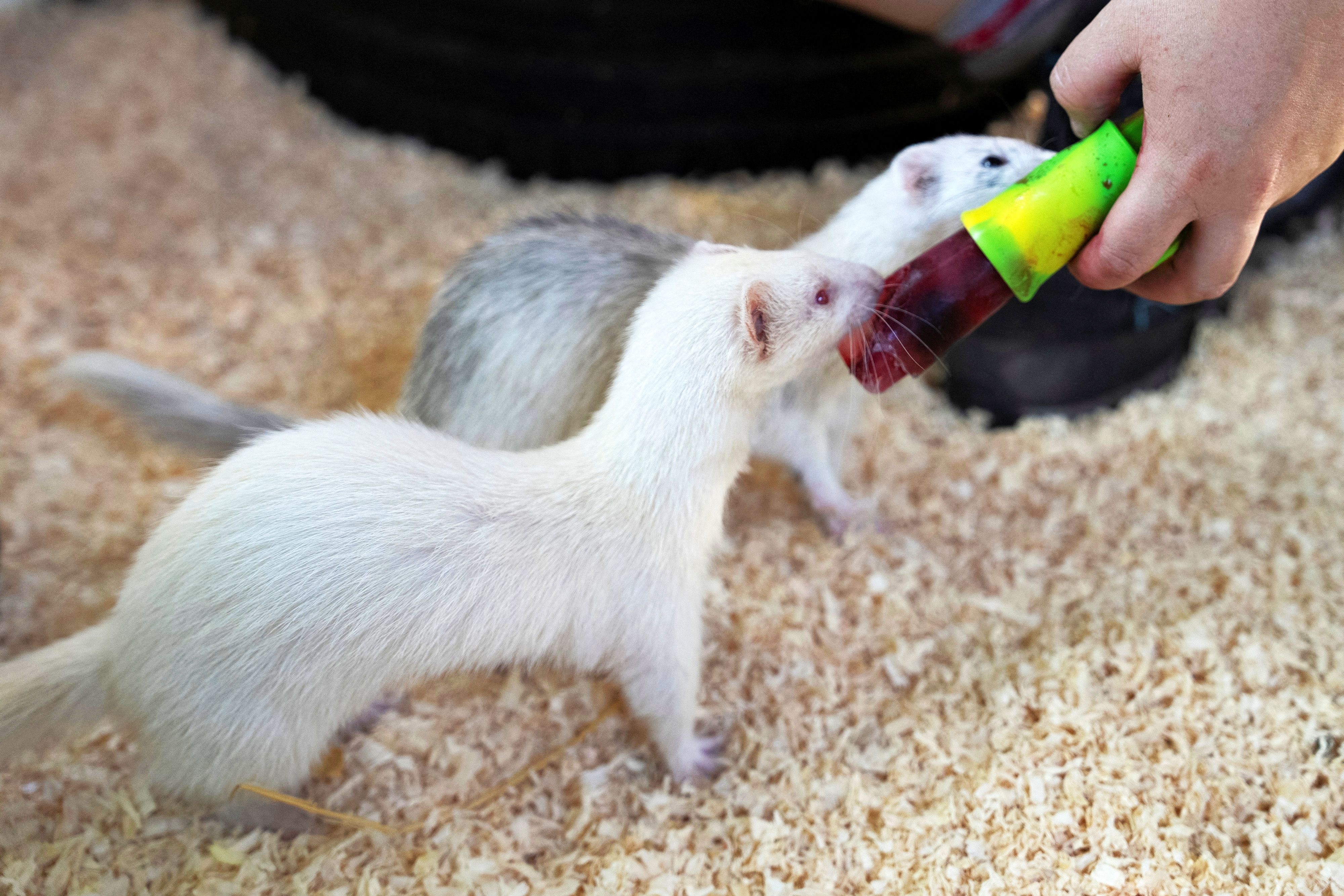 Ferrets sniff a fruit ice pop at Stepney City Farm, where staff work to keep animals cool during a heatwave in London, Britain, on June 22, 2025. (Photo by Carlos Jasso/Reuters)