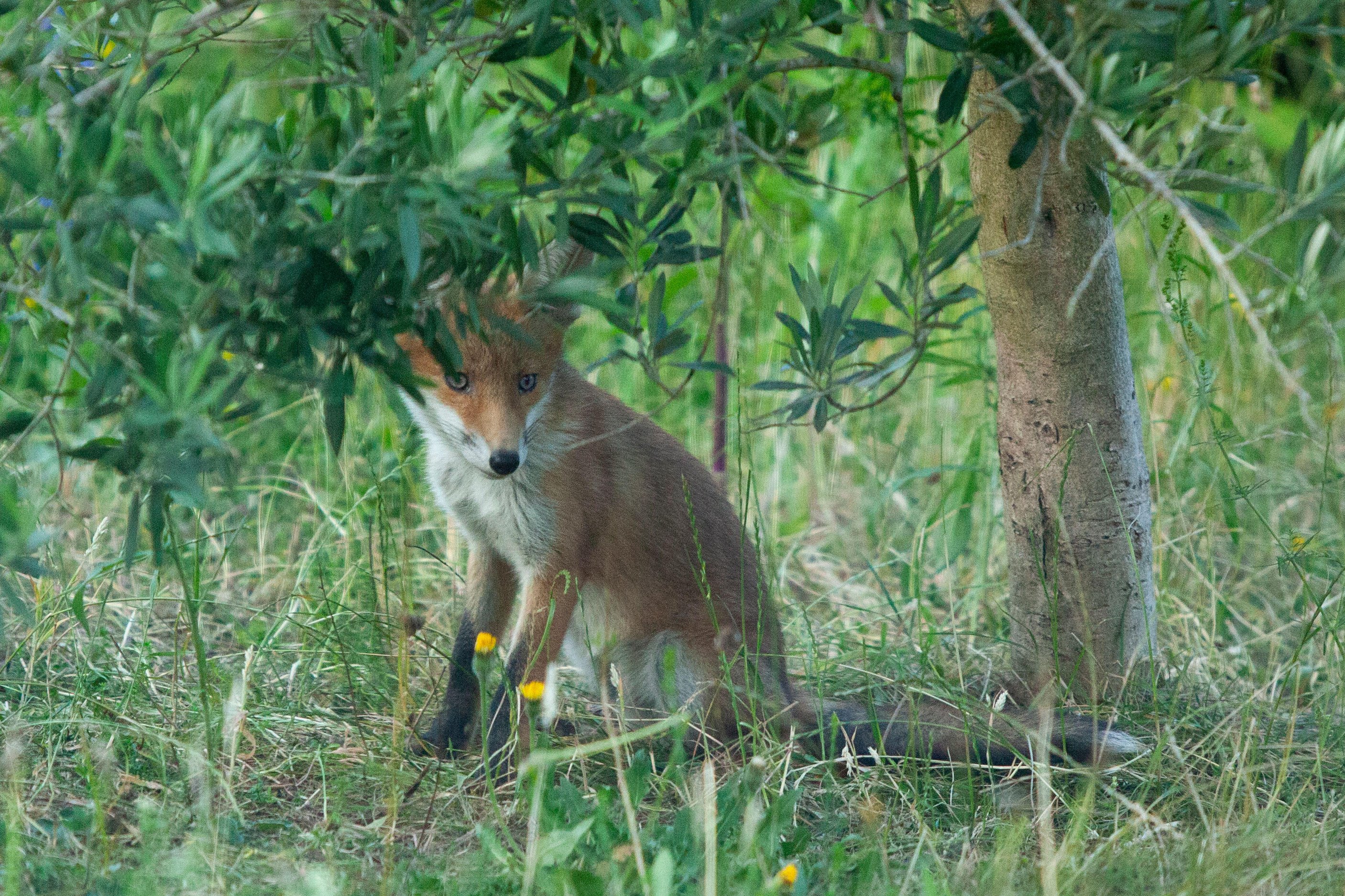 In a garden in Clapham, south London, after a day spent hiding in the shade, a three-month-old fox club sits under an olive tree on June 19, 2025. The next two days are expected to remain exptremely hot before cooling a bit on Sunday. (Photo by Anna Watson/Alamy Live News)