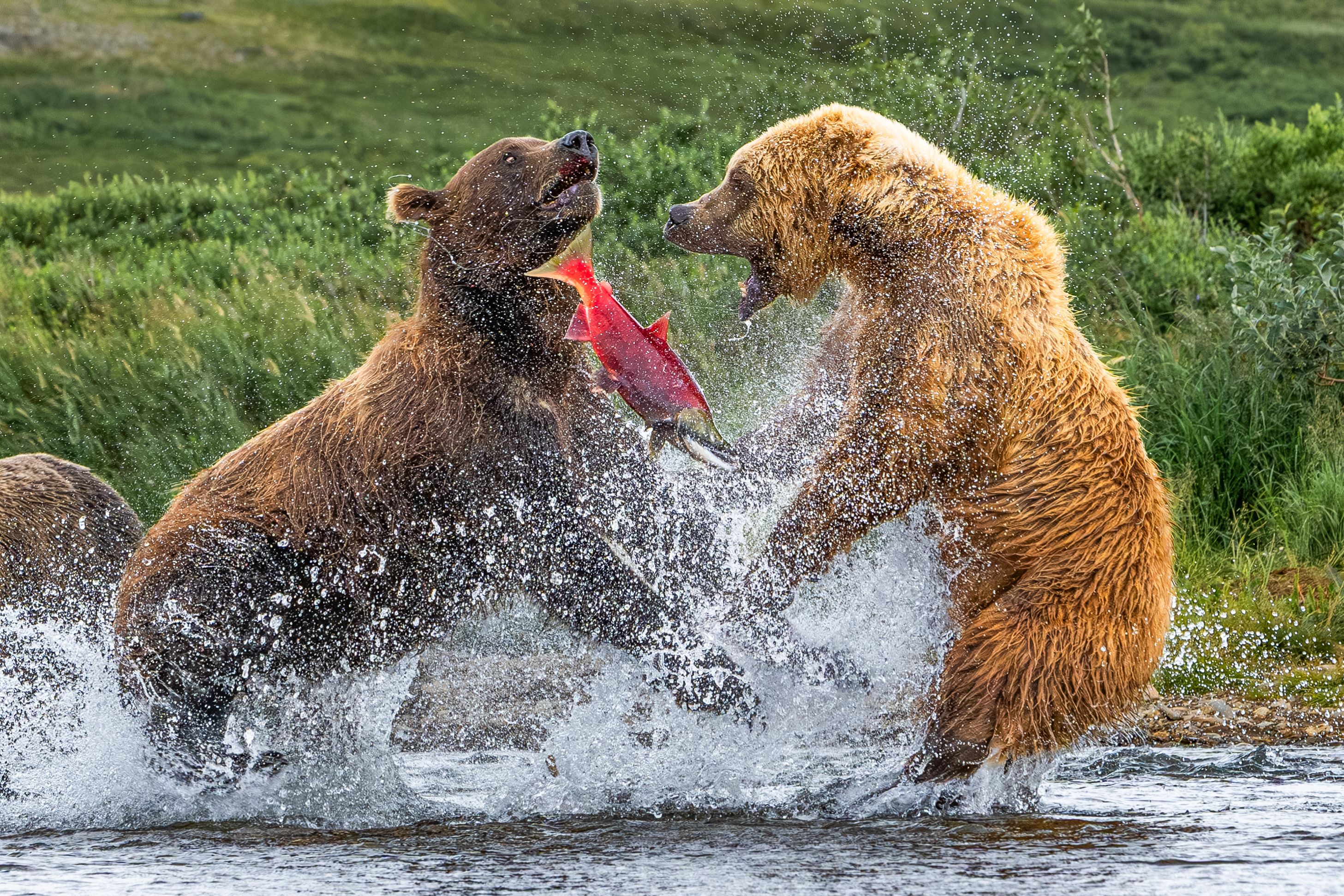 A pair of brown bears fight over a red salmon in Katmai National Park, in Alaska in the second decade of June 2025. (Photo by Sandy Nelson/Solent News & Photo Agency)