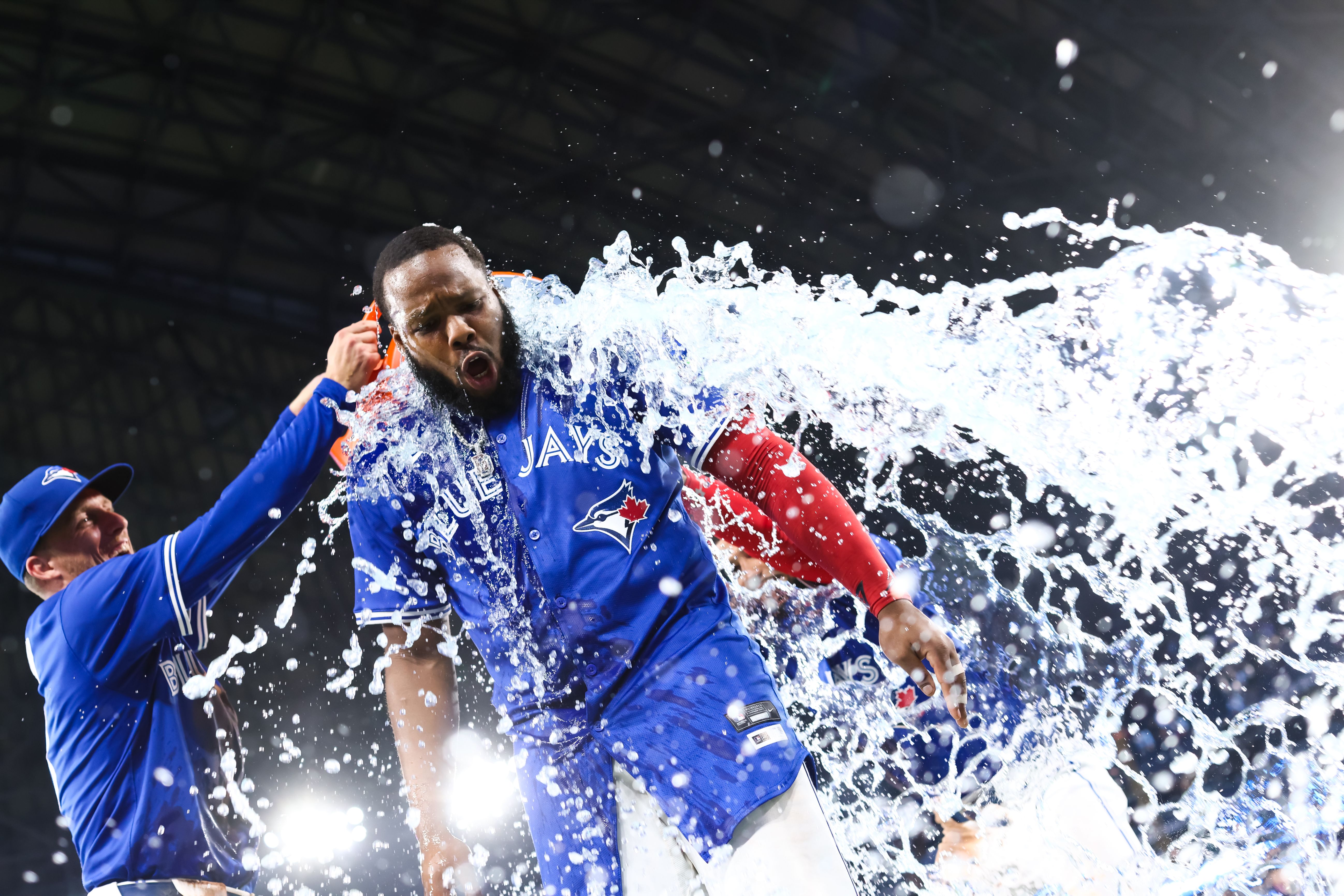 Vladimir Guerrero Jr. #27 of the Toronto Blue Jays gets an ice bath from Myles Straw #3 after their MLB game against the New York Yankees at Rogers Centre on June 30, 2025 in Toronto, Ontario, Canada. (Photo by Cole Burston/Getty Images)