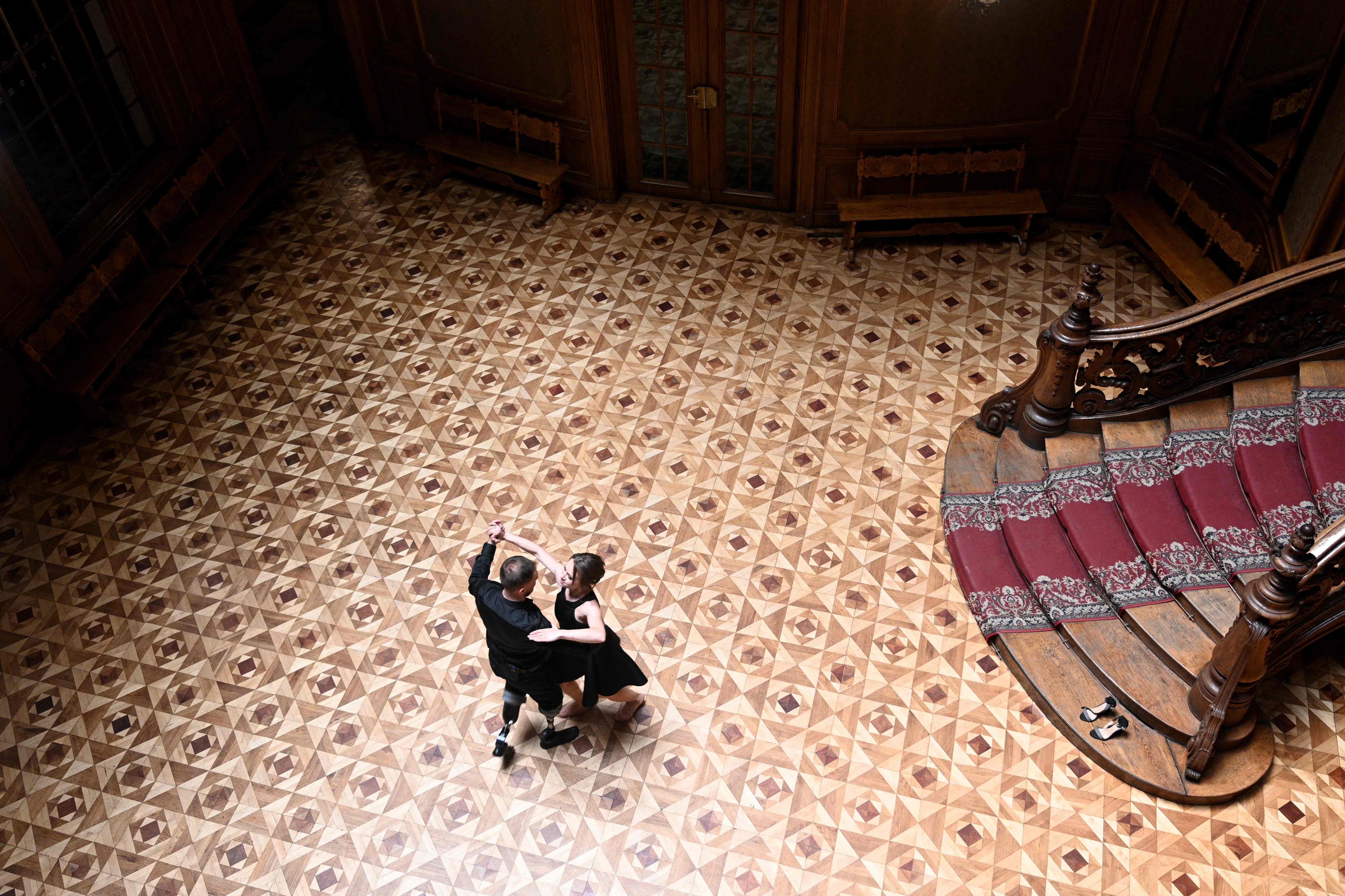 Oleksandr Zavnenko, a Ukrainian amputee veteran of the Russian-Ukrainian war and patient of the Unbroken rehabilitation centre, dances on prosthetic legs with his wife Maria in Lviv on June 4, 2025, amid the Russian invasion in Ukraine. Oleksandr, 36, a veteran of the 12th Special Forces Brigade “Azov”, before the war, he danced while his wife Maria is a professional choreographer. In October 2024, Oleksandr lost both of his lower limbs in battle. Despite this, he always dreamed of returning to his life. This dance is a representation of Oleksandr's dream, which for the first time, he danced with prosthetic. (Photo by Yuriy Dyachyshyn/AFP Photo)