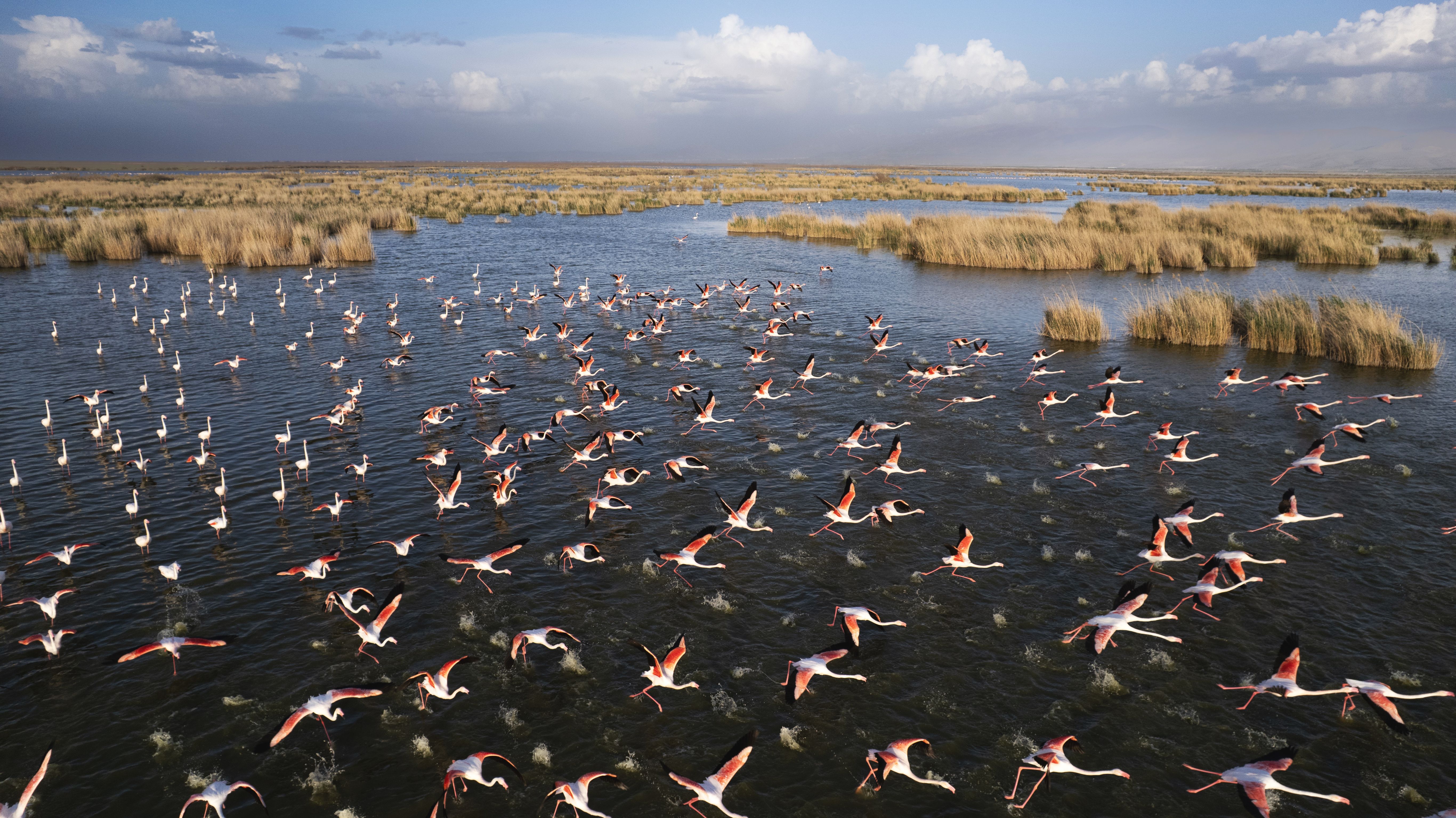 An aerial view of Akgol Reeds, one of Turkiye's most important wetlands, is home to Anatolia's “crane in blush” flamingos, rice paddy and different bird species in Eregli district of Konya, Turkiye on May 25, 2025. Akgol Reeds, known as Konya's bird paradise, is among the places frequented by photography enthusiasts and nature lovers. (Photo by Engin Ayyildiz/Anadolu via Getty Images)