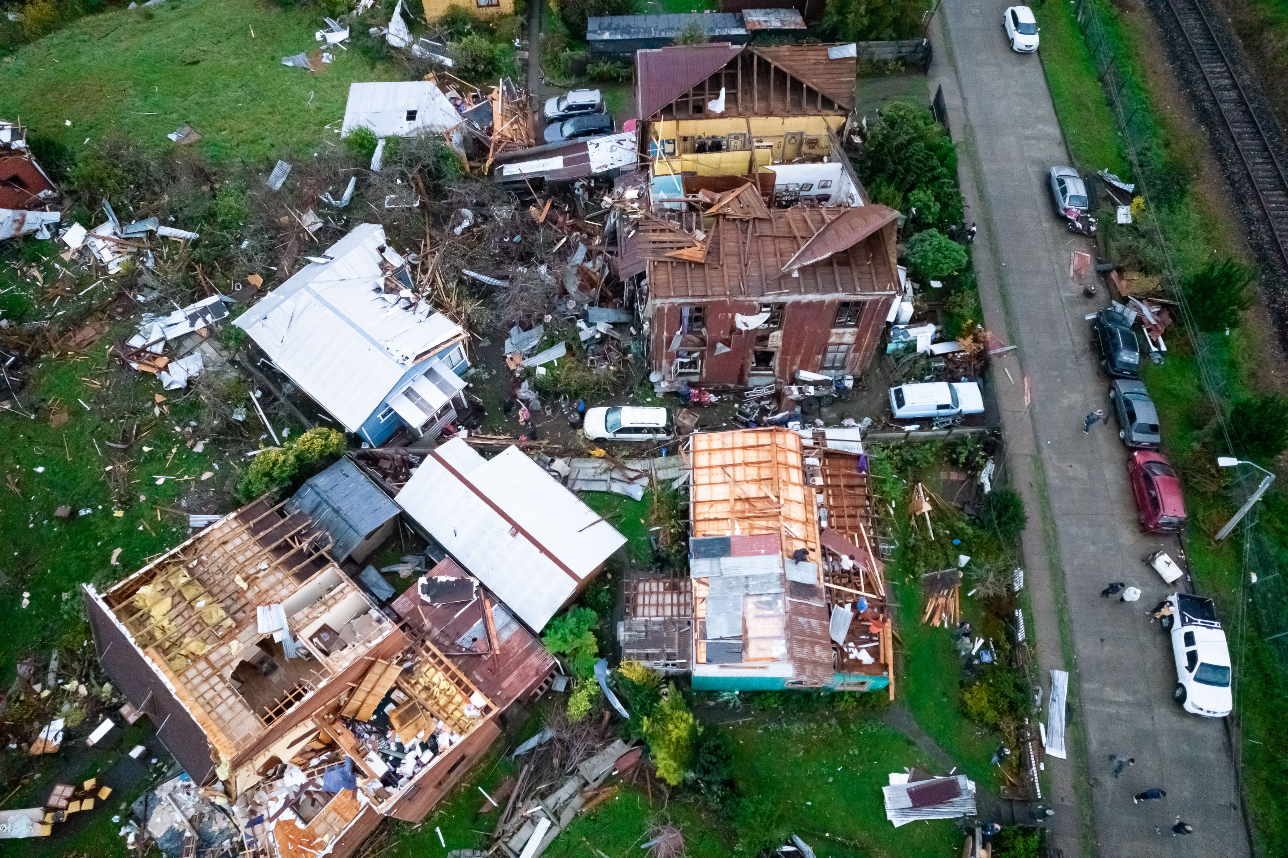 An aerial view shows the destruction caused by a tornado in Puerto Varas, Chile, 25 May 2025. More than fifteen thousand homes remain without electricity and other basic supplies in the tourist city of Puerto Varas, in southern Chile, after being hit by a tornado that destroyed more than a hundred houses and left a dozen injured. (Photo by Felipe Constanzo/EPA