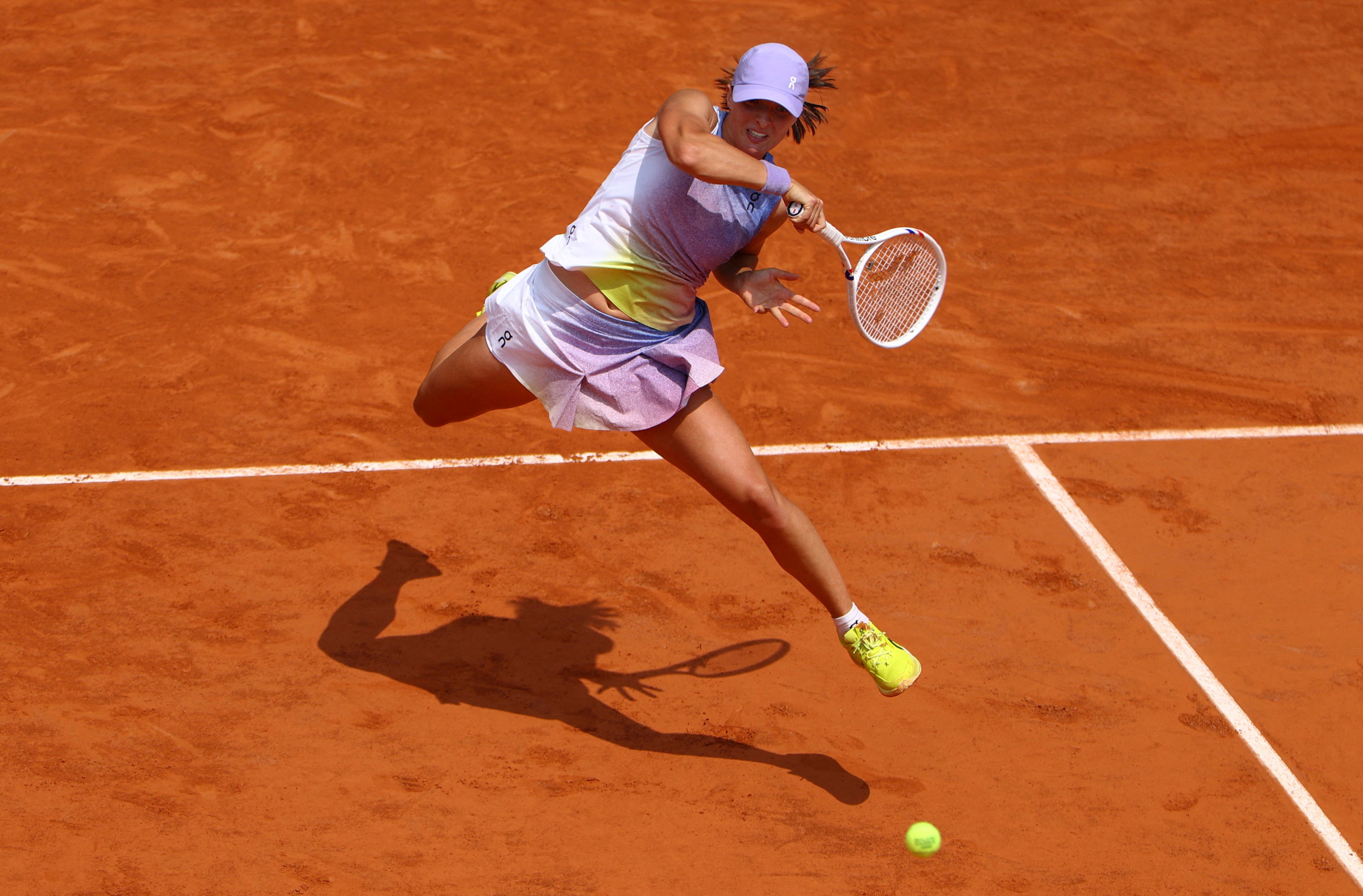 Poland's Iga Swiatek plays a backhand return to Ukraine's Elina Svitolina during their quarter-final women's singles match on day 10 of the French Open tennis tournament on Court Philippe-Chatrier at the Roland-Garros Complex in Paris on June 3, 2025. (Photo by Lisi Niesner/Reuters)