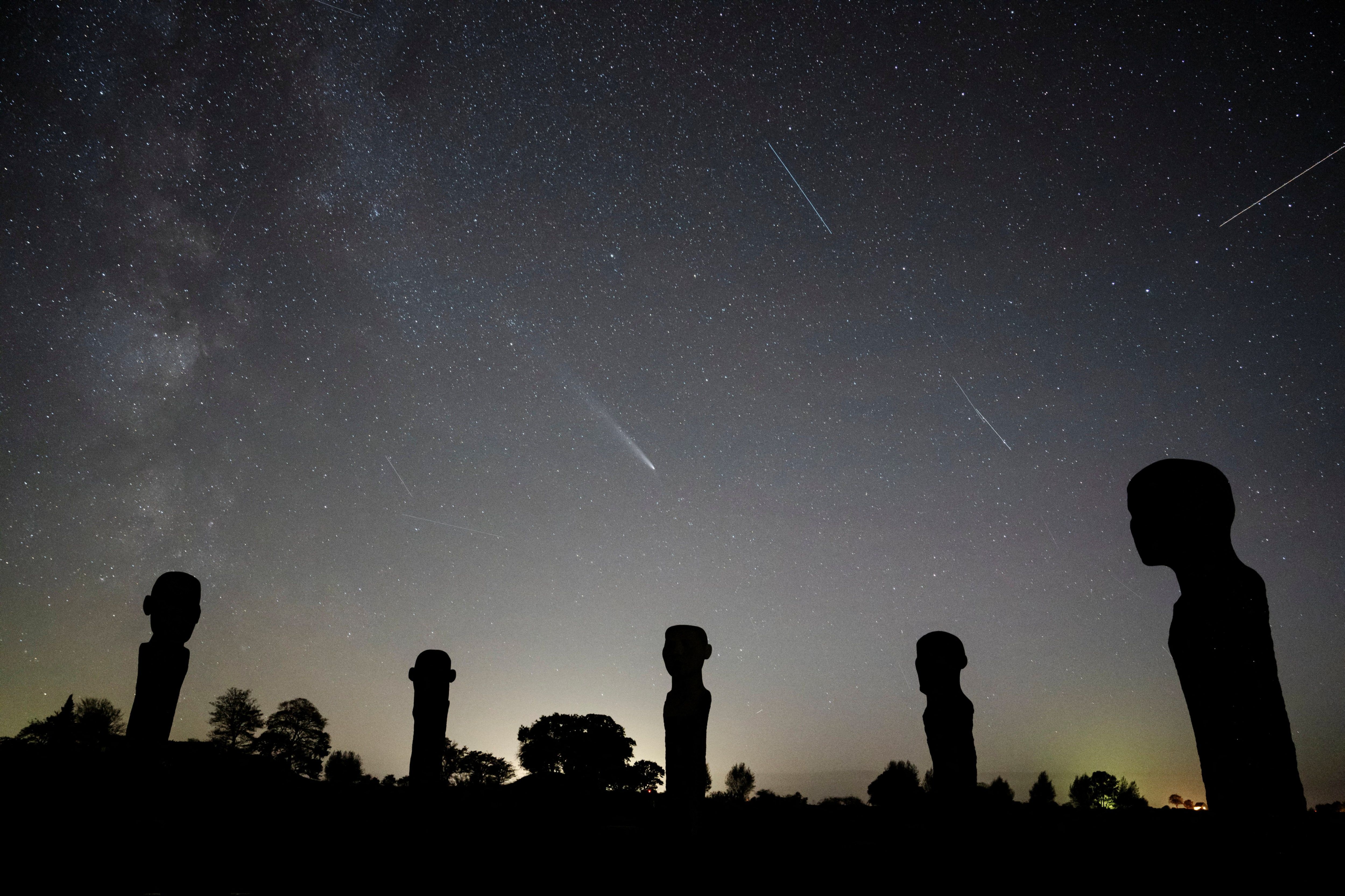 Comet C/2023 A3 - Tsuchinshan-ATLAS is seen in the sky above the artwork Dodekalitten at Lolland southern Zealand, Denmark on October 22, 2024. (Photo by Mads Claus Rasmussen/Ritzau Scanpix via AFP Photo)