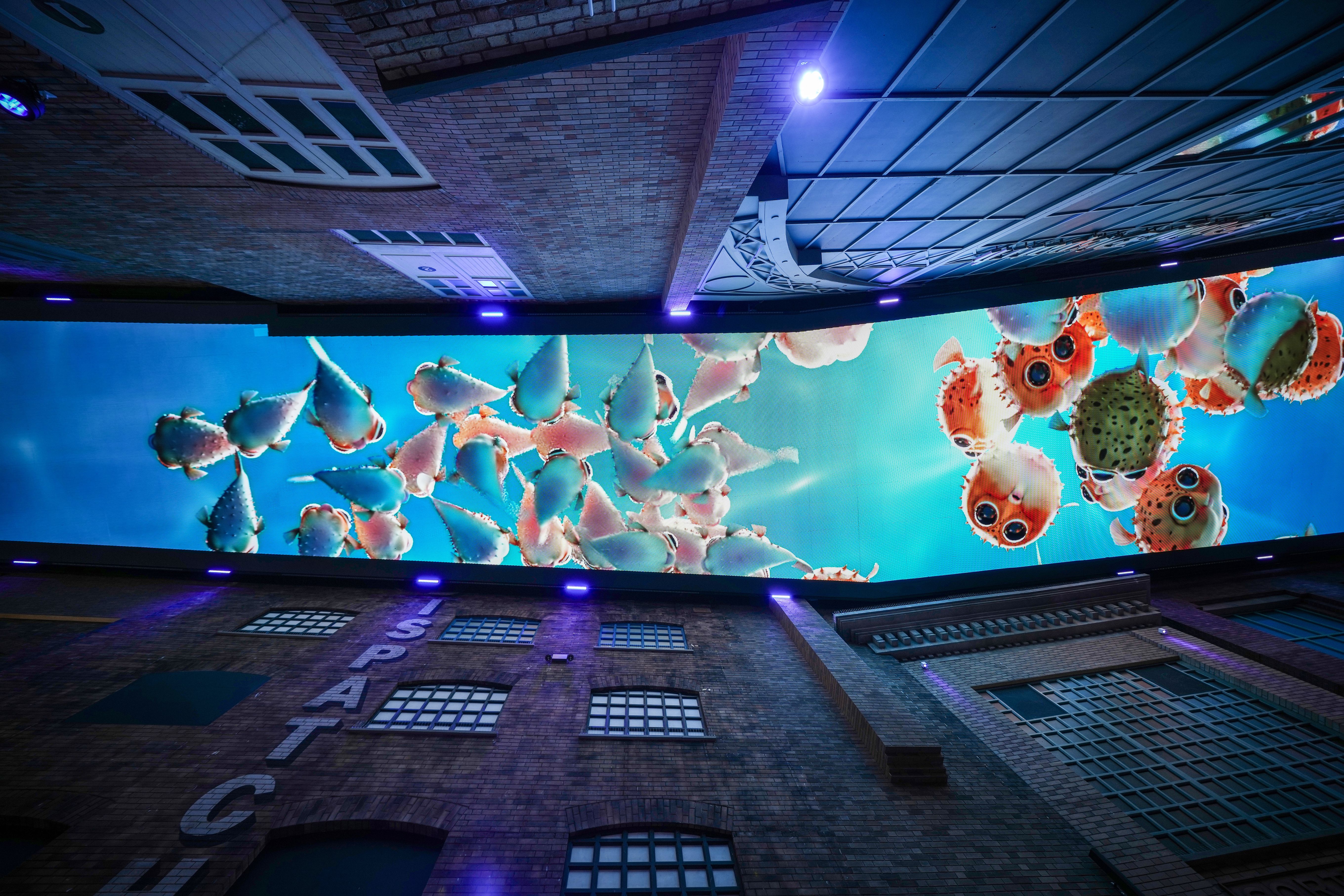 Animations appear on the new 1000m2 screen adorning the ceiling of Printworks on March 20, 2024 in Manchester, England. The entertainment venue recently underwent a £21-million renovation, including the installation of a digital screen the size of five tennis courts stretching across the building's ceiling. (Photo by Christopher Furlong/Getty Images)
