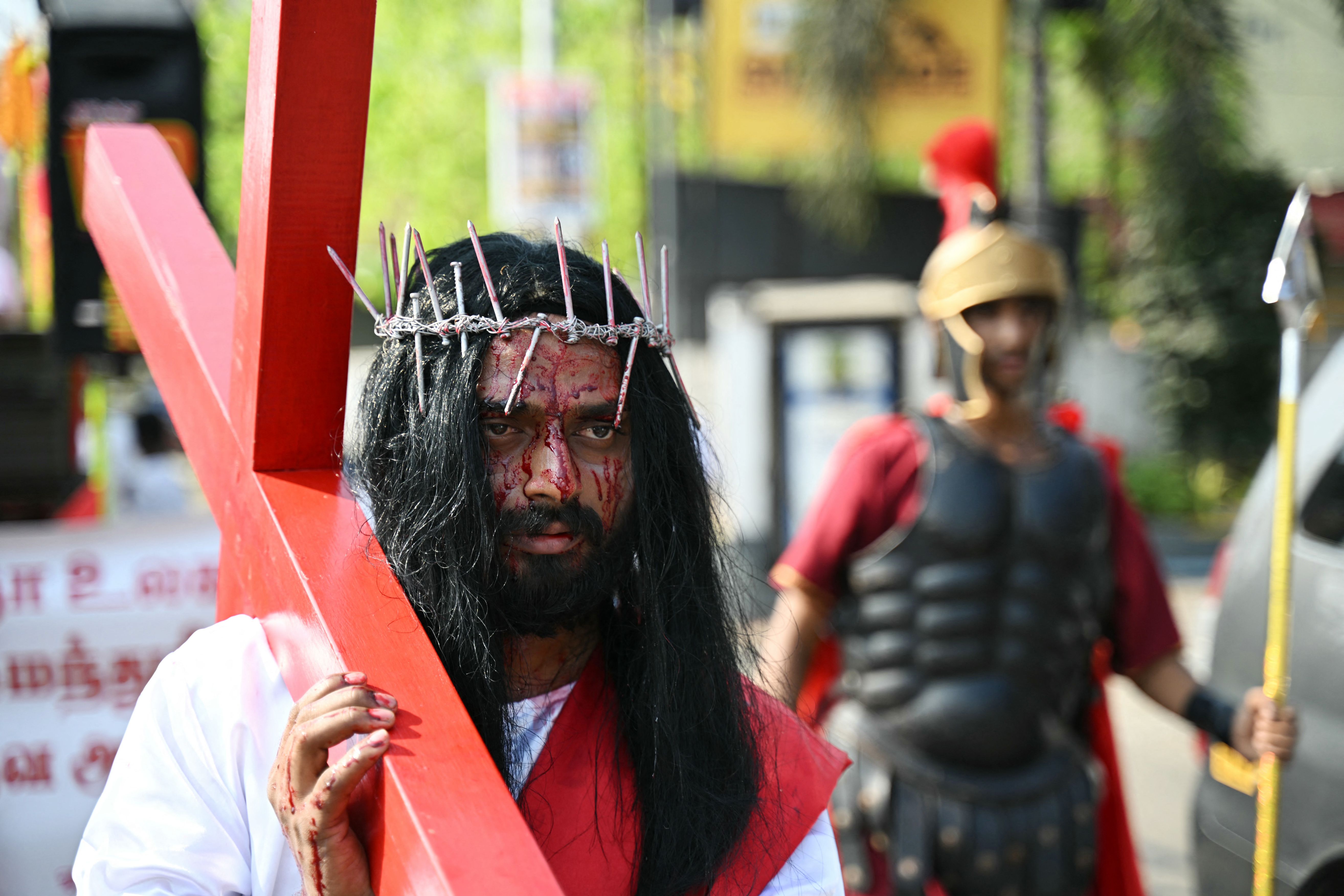 Christian devotees participate in the re-enactment of the crucifixion of Jesus Christ during a procession on Good Friday in Chennai India on March 29, 2024. (Photo by R.Satish Babu/AFP Photo)