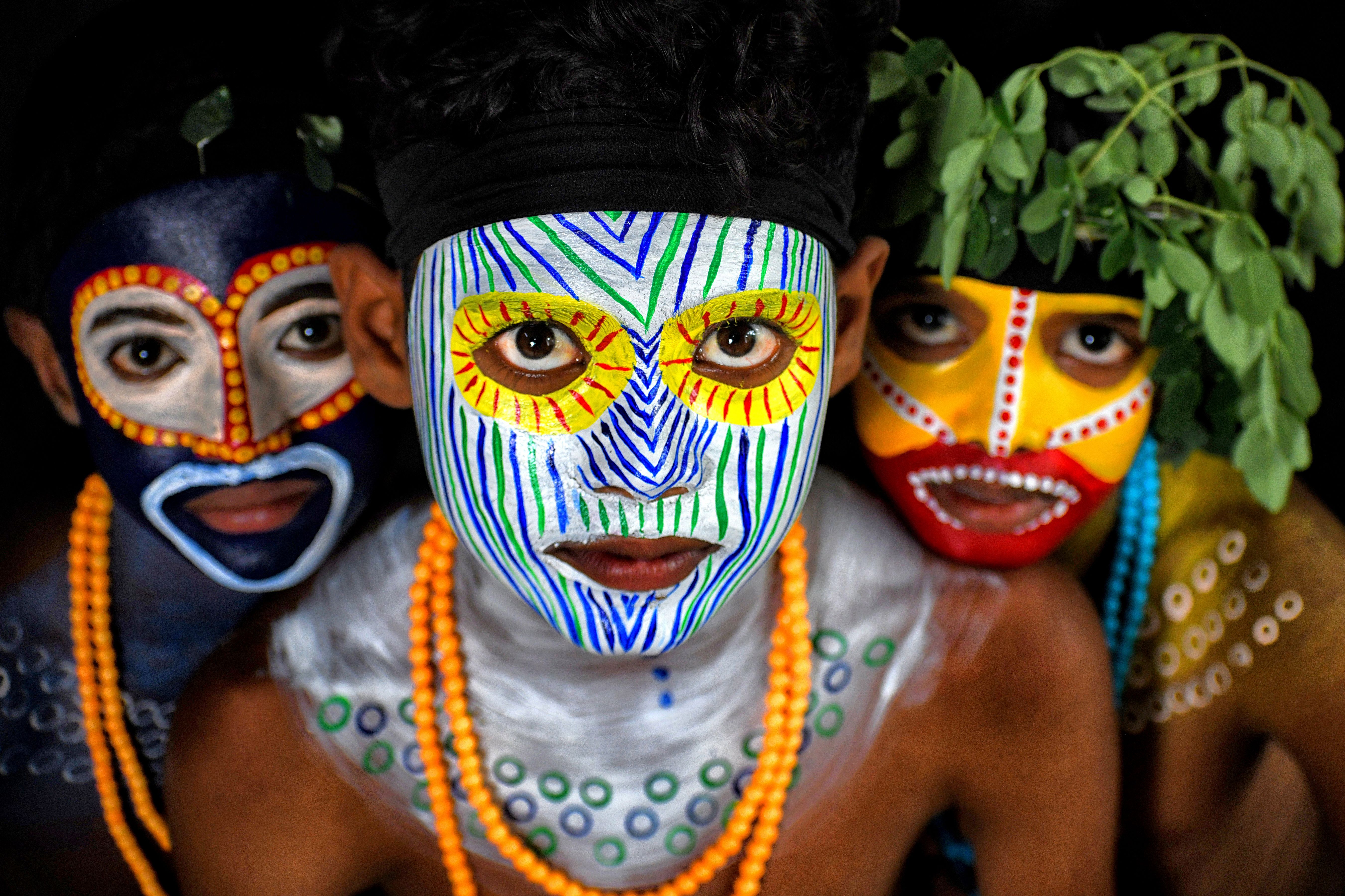 Young children pose with their faces painted during the event on June 15, 2025 in India. For generations Bahurupi artists from West Bengal have been practicing in the art of face painting. Using their painting techniques they can easily metamorphose into different characters during a performance, which often represents tribal myths. These traditional artists scrape a living from their performances, relying on the generosity of audiences for their income. (Photo by Avishek Das/SOPA Images/Rex Features/Shutterstock)