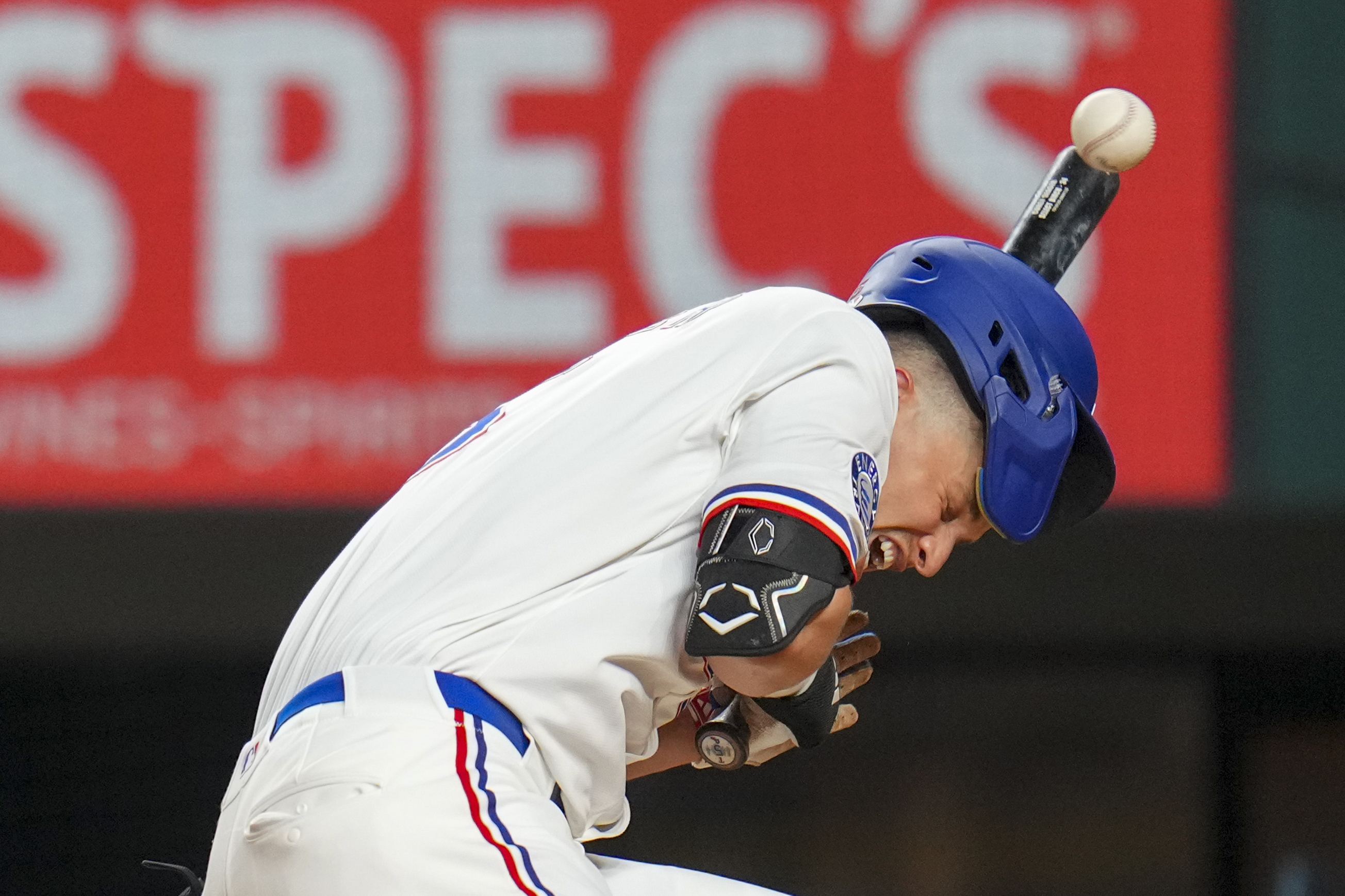 Texas Rangers' Corey Seager is hit by a pitch from Baltimore Orioles pitcher Gregory Soto during the eighth inning of a baseball game Tuesday, July 1, 2025, in Arlington, Texas. (Photo by Julio Cortez/AP Photo)