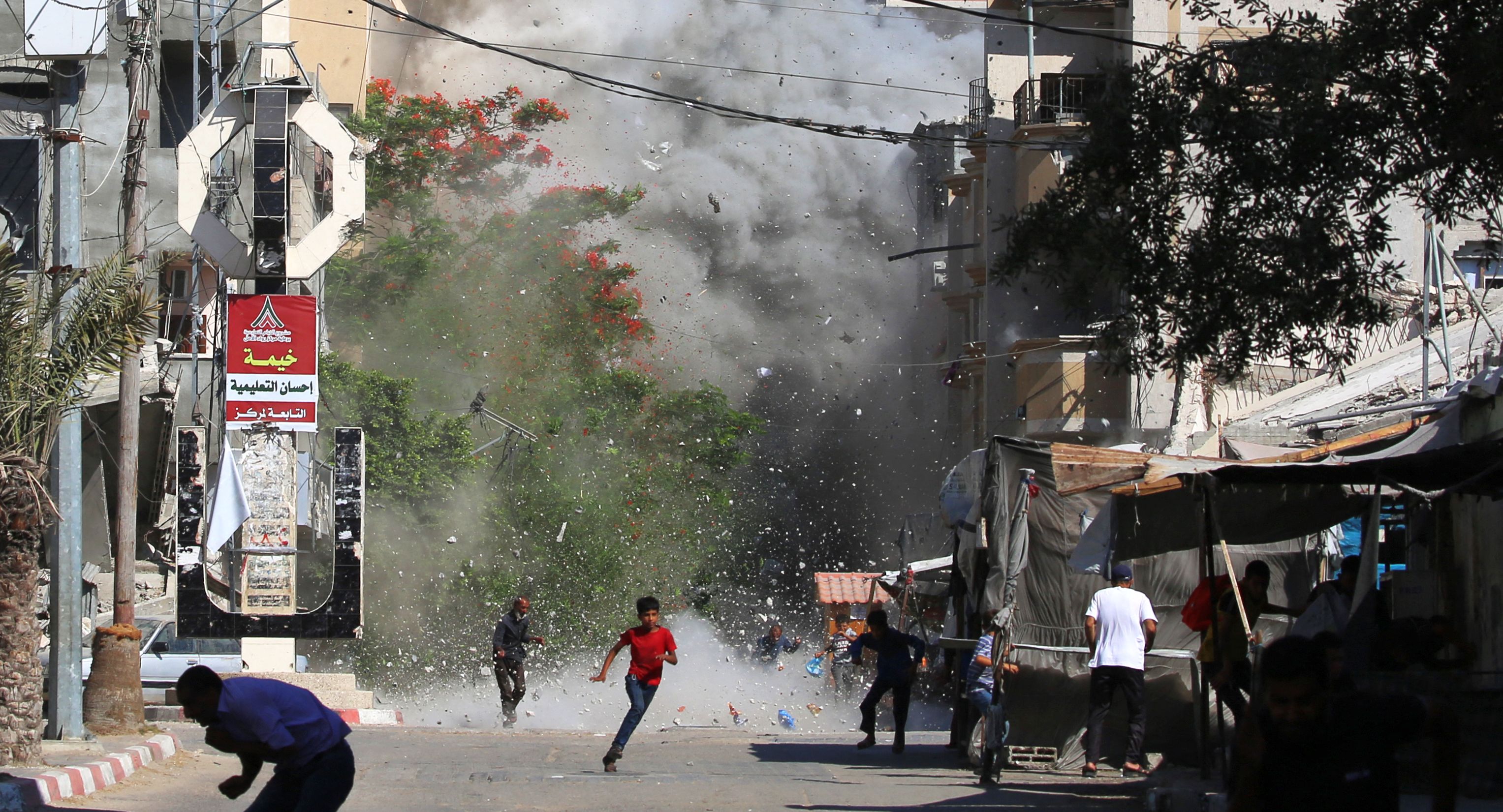 Palestinians rush for cover as debris flies around them after an Israeli strike on the Bureij camp for Palestinian refugees in the central Gaza Strip on June 15, 2025. Gaza's civil defence agency said 16 people were killed in Israeli military operations in the Palestinian territory on June 15, most of them while waiting for aid. (Photo by Eyad Baba/AFP Photo)