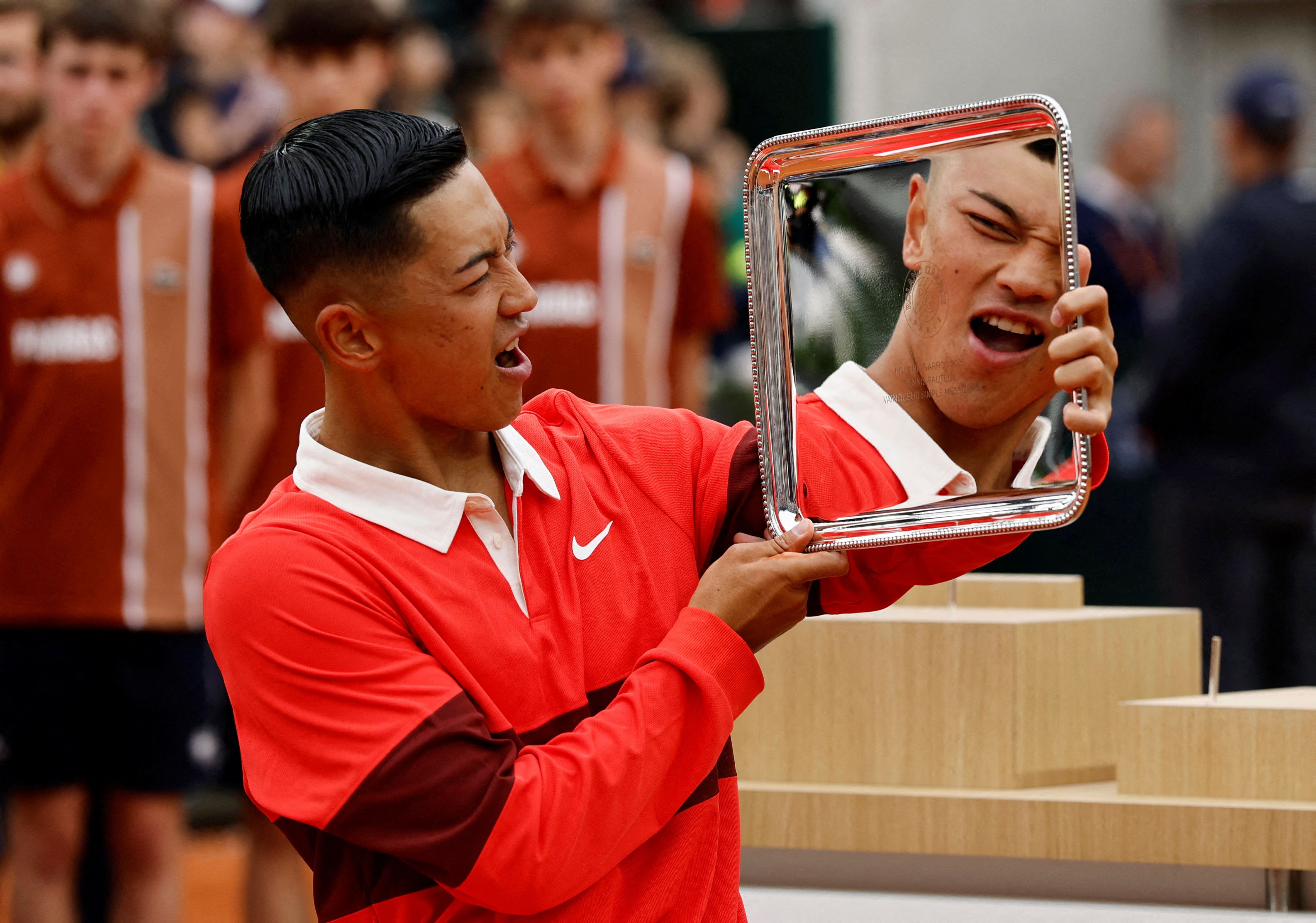 Japan's Tokito Oda poses with the trophy after winning his men's wheelchair singles final against Britain's Alfie Hewett on June 7, 2025. (Photo by Stephanie Lecocq/Reuters)