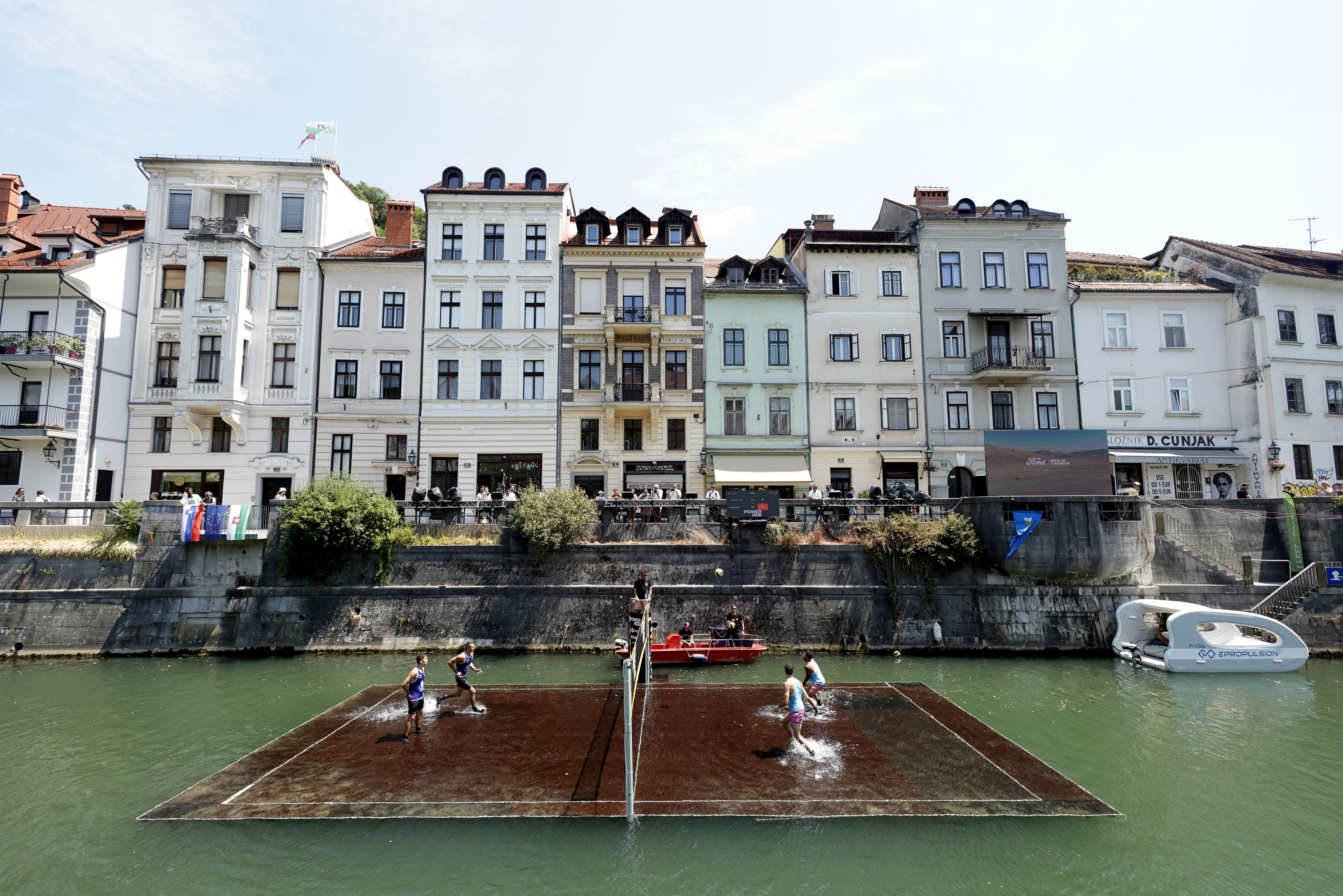 Teams compete on a partially-submerged volleyball court in the Slovenian capital Ljubljana on July 4, 2025. (Photo by Borut Zivulovic/Reuters)