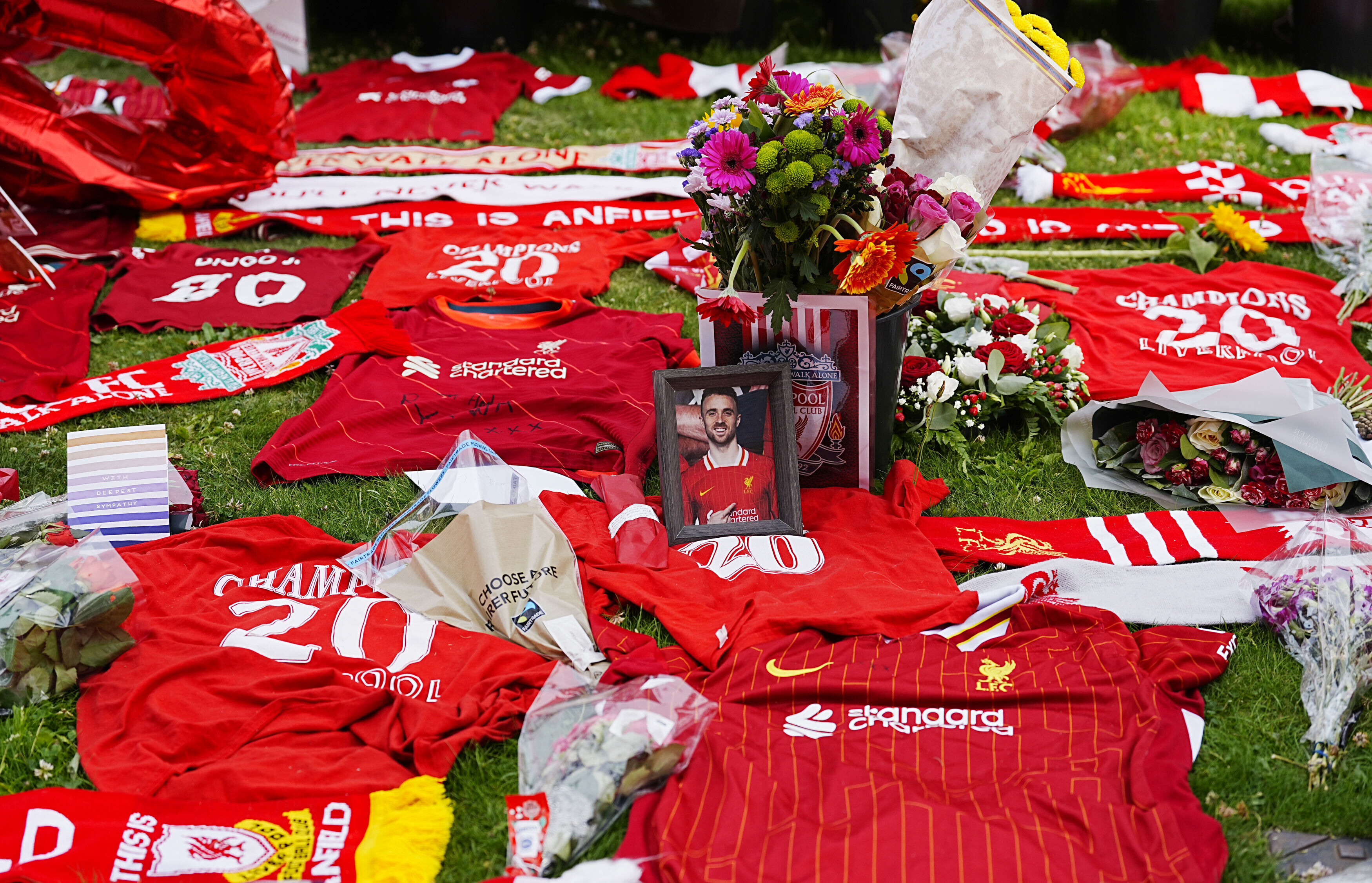 Tributes at Anfield Stadium, in Liverpool, England, Friday, July 4, 2025, in memory of Diogo Jota who has died at the age of 28. (Photo by Peter Byrne/PA via AP Photo)