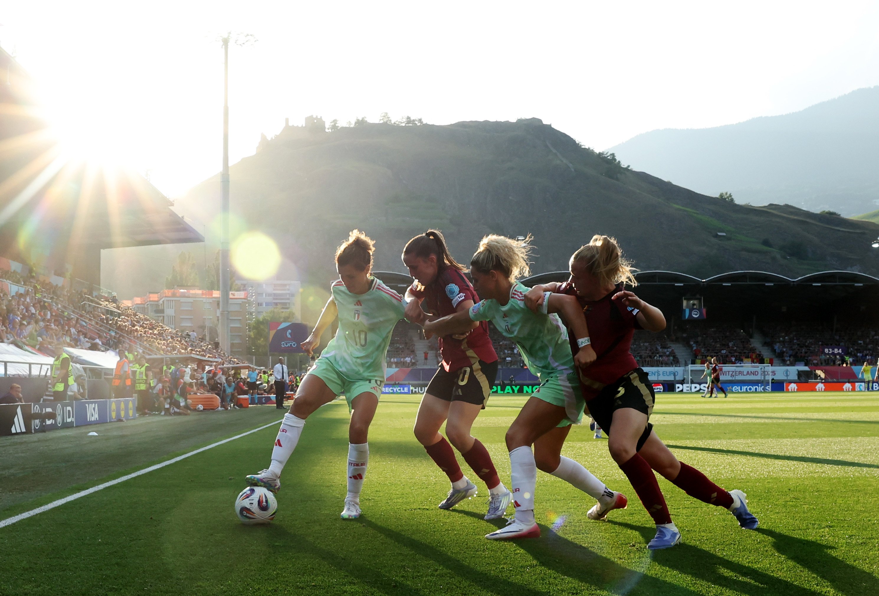 Cristiana Girelli and Emma Severini of Italy battle for possession with Marie Detruyer and Sarah Wijnants of Belgium during the UEFA Women's EURO 2025 Group B match between Belgium and Italy at Stade de Tourbillon on July 03, 2025 in Sion, Switzerland. (Photo by Eddie Keogh/Getty Images)