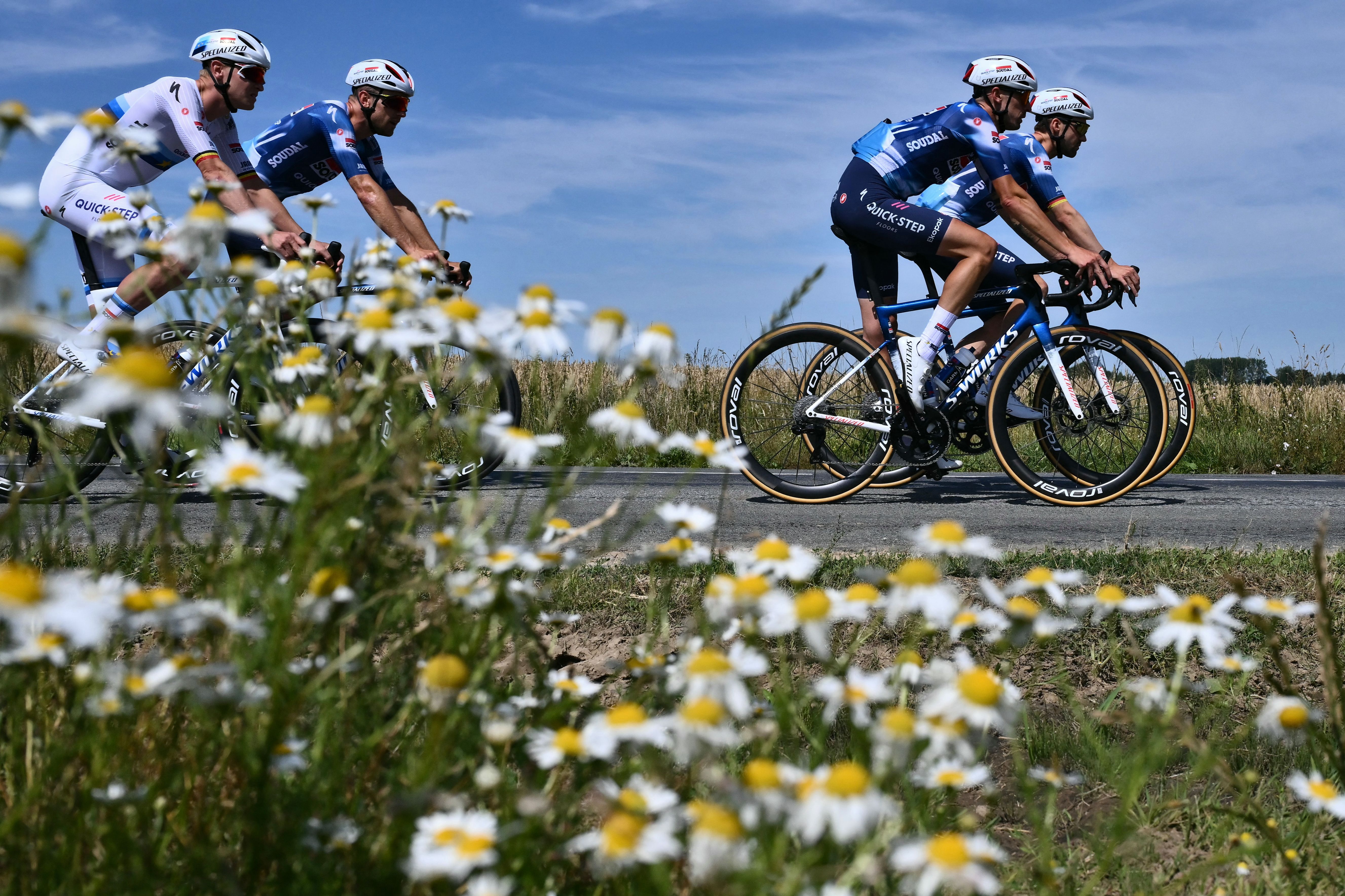 Soudal Quick-Step team riders cycle in a training session on the eve of the start of the 112th edition of the Tour de France cycling race, in Lille, northern France, on July 4, 2025. (Photo by Marco Bertorello/AFP Photo)