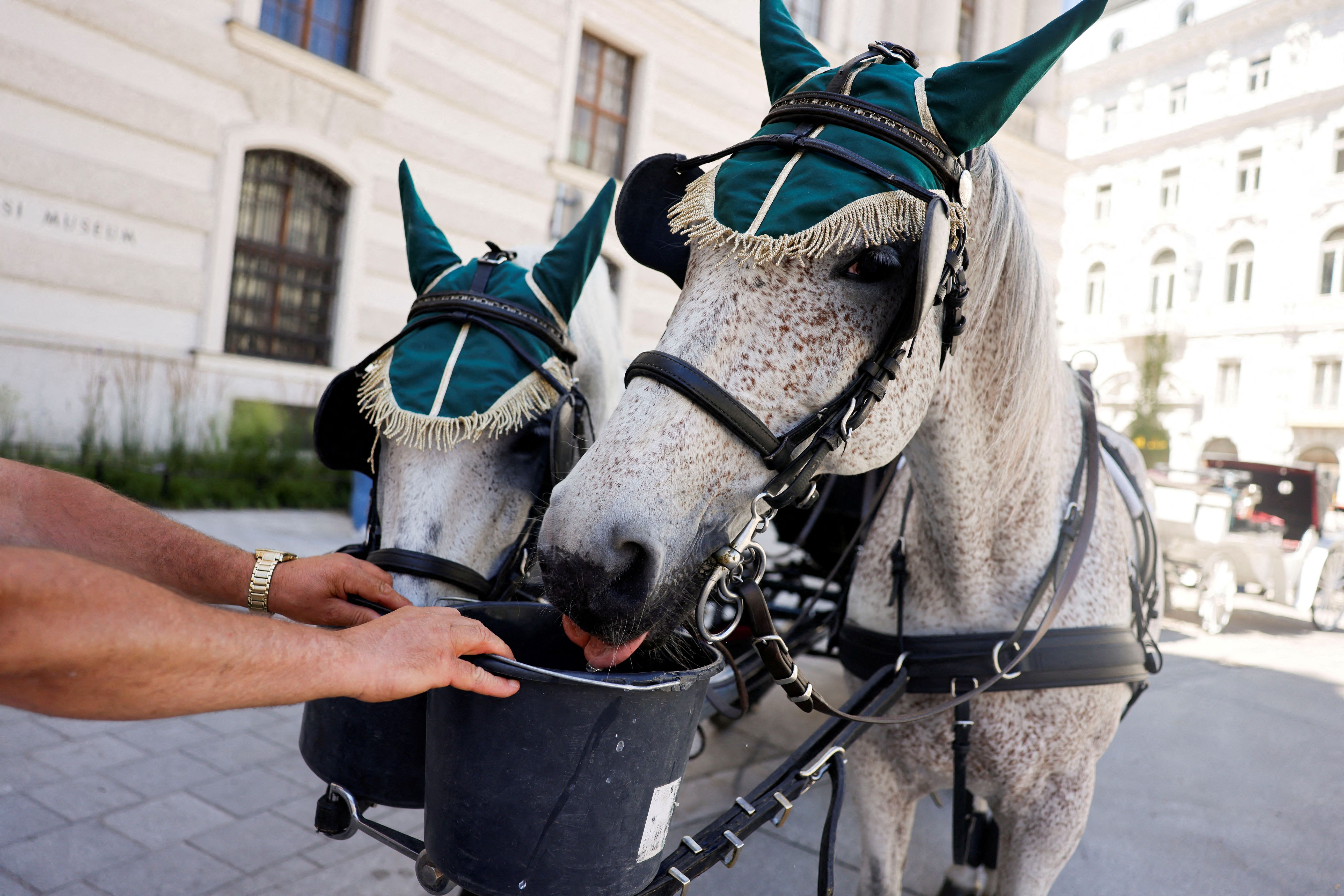 A carriage horse drinks some water as it stands on Michaelerplatz during a heat wave in Vienna, Austria on July 2, 2025. (Photo by Lisa Leutner/Reuters)